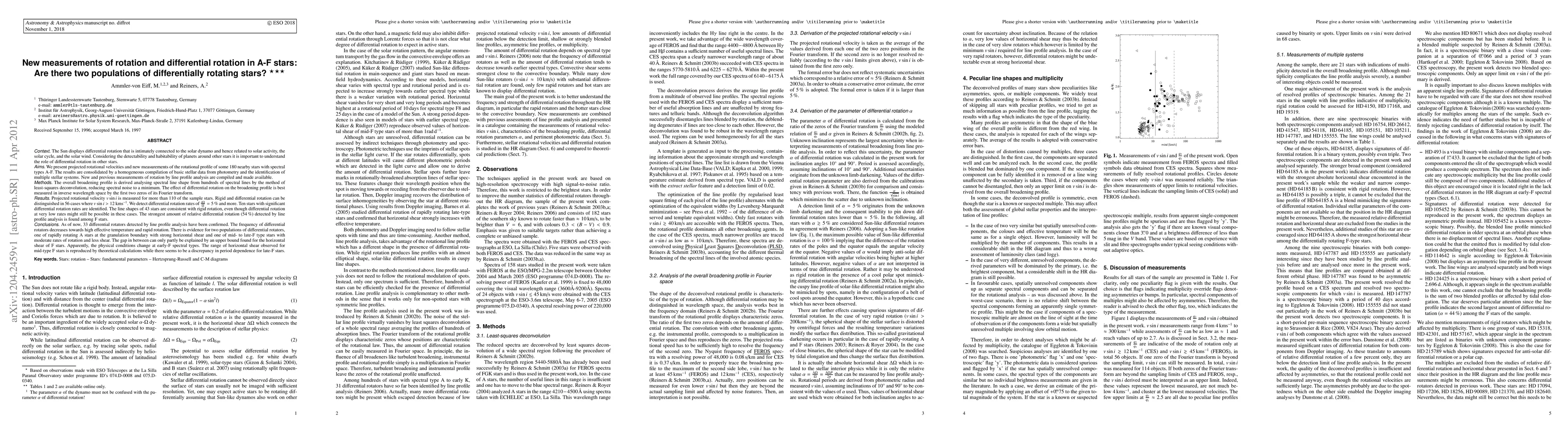 We present projected rotational velocities and new measurements of the rotational profile of some 180 nearby stars with spectral types A-F. The overall broadening profile is derived analysing spectral line shape from hundreds of spectral lines by the method of least-squares deconvolution. Rigid and differential rotation can be distinguished in 56 cases. Ten stars with significant differential rotation rates are identified. As of now, 33 differential rotators detected by line profile analysis have been confirmed. The frequency of differential rotators decreases towards high effective temperature and rapid rotation. There is evidence for two populations of differential rotators with a gap in between at spectral type early-F. The gap can only partly be explained by an upper bound found for the horizontal shear of F stars. Apparently, the physical conditions of differential rotation change at early-F spectral types.