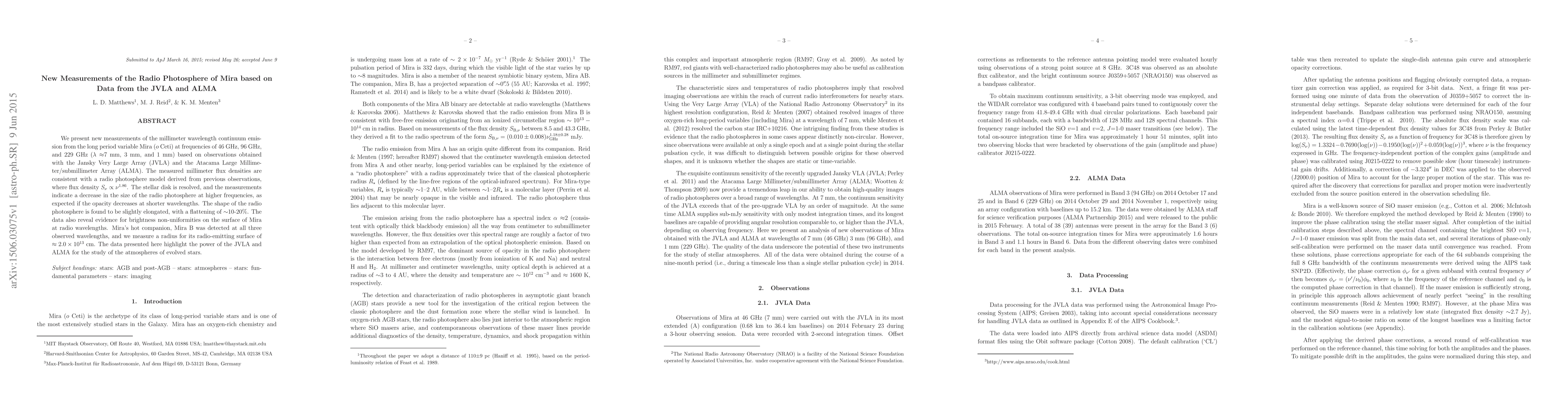 We present new measurements of the millimeter wavelength continuum emission from the long period variable Mira ($o$ Ceti) at frequencies of 46 GHz, 96 GHz, and 229 GHz ($\lambda$~7 mm, 3 mm, and 1 mm) based on observations obtained with the Jansky Very Large Array (JVLA) and the Atacama Large Millimeter/submillimeter Array (ALMA). The measured millimeter flux densities are consistent with a radio photosphere model derived from previous observations, where flux density, $S_{\nu}\propto\nu^{1.86}$. The stellar disk is resolved, and the measurements indicate a decrease in the size of the radio photosphere at higher frequencies, as expected if the opacity decreases at shorter wavelengths. The shape of the radio photosphere is found to be slightly elongated, with a flattening of ~10-20%. The data also reveal evidence for brightness non-uniformities on the surface of Mira at radio wavelengths. Mira's hot companion, Mira B was detected at all three observed wavelengths, and we measure a radius for its radio-emitting surface of $\approx2.0\times10^{13}$ cm. The data presented here highlight the power of the JVLA and ALMA for the study of the atmospheres of evolved stars.