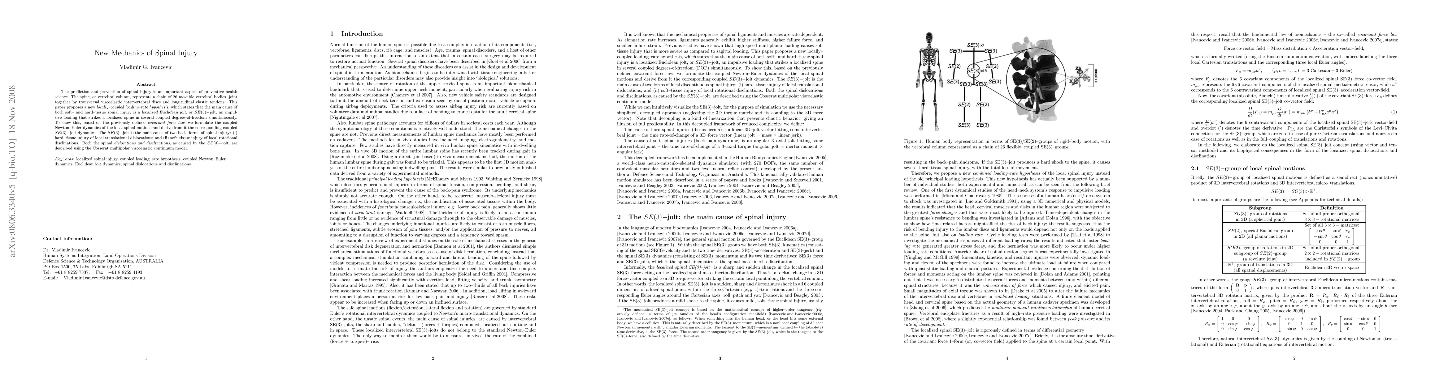 The prediction and prevention of spinal injury is an important aspect of preventive health science. The spine, or vertebral column, represents a chain of 26 movable vertebral bodies, joint together by transversal viscoelastic intervertebral discs and longitudinal elastic tendons. This paper proposes a new locally-coupled loading-rate hypothesis}, which states that the main cause of both soft- and hard-tissue spinal injury is a localized Euclidean jolt, or SE(3)-jolt, an impulsive loading that strikes a localized spine in several coupled degrees-of-freedom simultaneously. To show this, based on the previously defined covariant force law, we formulate the coupled Newton-Euler dynamics of the local spinal motions and derive from it the corresponding coupled SE(3)-jolt dynamics. The SE(3)-jolt is the main cause of two basic forms of spinal injury: (i) hard-tissue injury of local translational dislocations; and (ii) soft-tissue injury of local rotational disclinations. Both the spinal dislocations and disclinations, as caused by the SE(3)-jolt, are described using the Cosserat multipolar viscoelastic continuum model. Keywords: localized spinal injury, coupled loading-rate hypothesis, coupled Newton-Euler dynamics, Euclidean jolt dynamics, spinal dislocations and disclinations