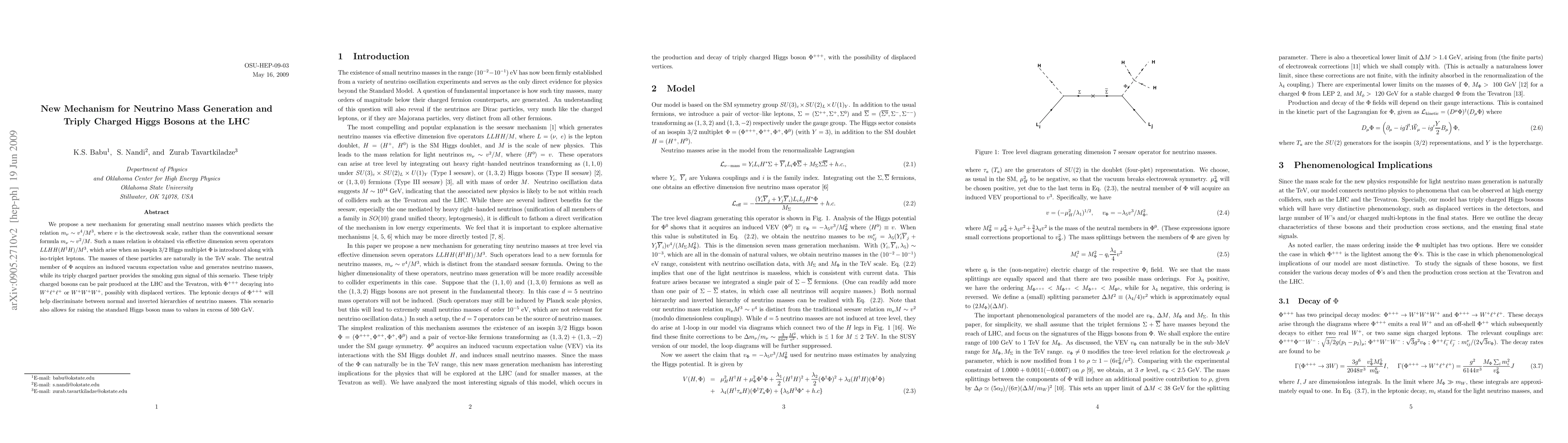 This paper proposes a novel mechanism for generating small neutrino masses via dimension seven operators, predicting a different mass relation than the conventional seesaw mechanism. It also predicts triply charged Higgs bosons, which can be produced at the LHC and provide a distinctive signature for this scenario.