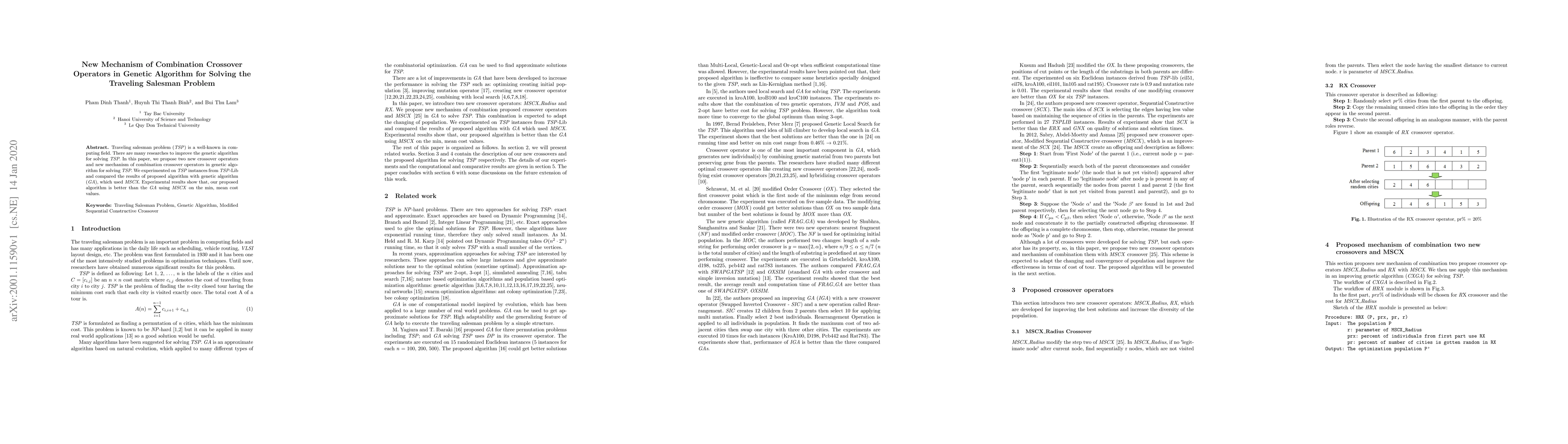 Traveling salesman problem (TSP) is a well-known in computing field. There are many researches to improve the genetic algorithm for solving TSP. In this paper, we propose two new crossover operators and new mechanism of combination crossover operators in genetic algorithm for solving TSP. We experimented on TSP instances from TSP-Lib and compared the results of proposed algorithm with genetic algorithm (GA), which used MSCX. Experimental results show that, our proposed algorithm is better than the GA using MSCX on the min, mean cost values.