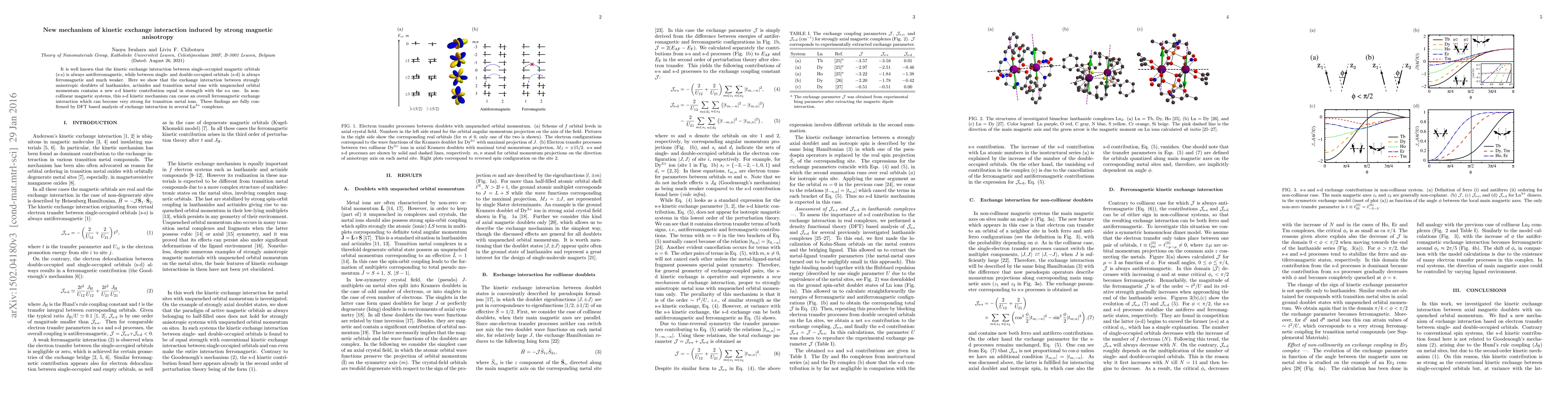 It is well known that the kinetic exchange interaction between single-occupied magnetic orbitals (s-s) is always antiferromagnetic, while between single- and double-occupied orbitals (s-d) is always ferromagnetic and much weaker. Here we show that the exchange interaction between strongly anisotropic doublets of lanthanides, actinides and transition metal ions with unquenched orbital momentum contains a new s-d kinetic contribution equal in strength with the s-s one. In non-collinear magnetic systems, this s-d kinetic mechanism can cause an overall ferromagnetic exchange interaction which can become very strong for transition metal ions. These findings are fully confirmed by DFT based analysis of exchange interaction in several Ln$^{3+}$ complexes.