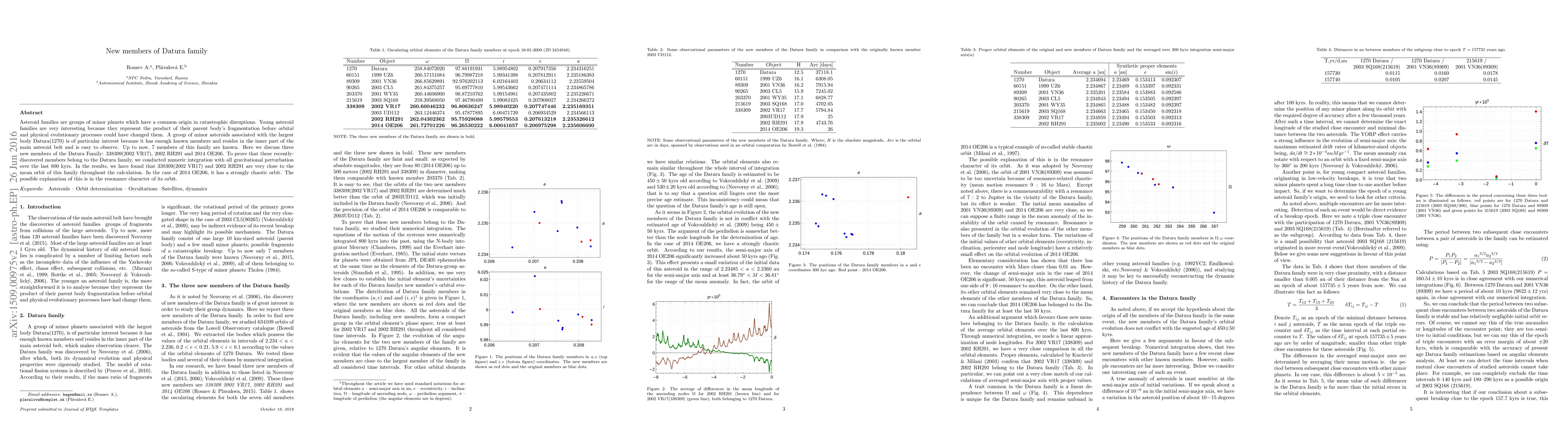 Asteroid families are groups of minor planets which have a common origin in catastrophic disruptions. Young asteroid families are very interesting because they represent the product of their parent body's fragmentation before orbital and physical evolutionary processes could have changed them. A group of minor asteroids associated with the largest body Datura(1270) is of particular interest because it has enough known members and resides in the inner part of the main asteroid belt and is easy to observe. Up to now, 7 members of this family are known. Here we discuss three new members of the Datura Family: 338309(2002 VR17), 2002 RH291 and 2014 OE206. To prove that these recently-discovered members belong to the Datura family, we conducted numeric integration with all gravitational perturbation over the last 800 kyrs. In the results, we have found that 338309(2002 VR17) and 2002 RH291 are very close to the mean orbit of this family throughout the calculation. In the case of 2014 OE206, it has a strongly chaotic orbit. The possible explanation of this is in the resonance character of its orbit.