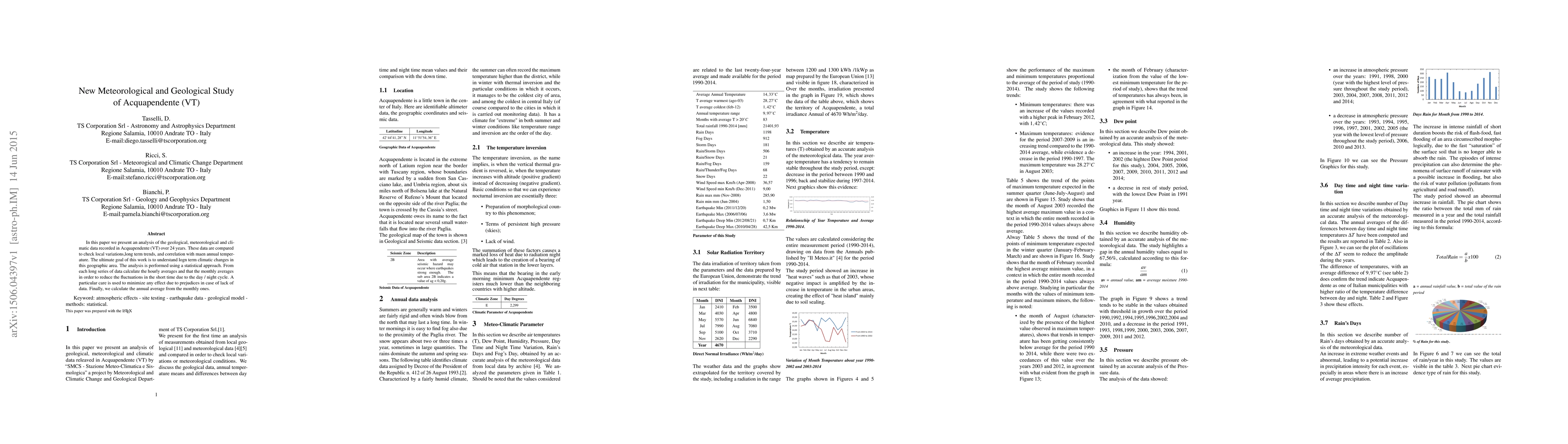 In this paper we present an analysis of the geological, meteorological and climatic data recorded in Acquapendente (VT) over 24 years. These data are compared to check local variations,long term trends, and correlation with maen annual temperature. The ultimate goal of this work is to understand logn term climatic changes in this geographic area. The analysis is performed using a statistical approach. From each long series of data calculate the hourly averages and that the monthly averages in order to reduce the fluctuations in the short time due to the day / night cycle. A particular care is used to minimize any effect due to prejudices in case of lack of data. Finally, we calculate the annual average from the monthly ones.