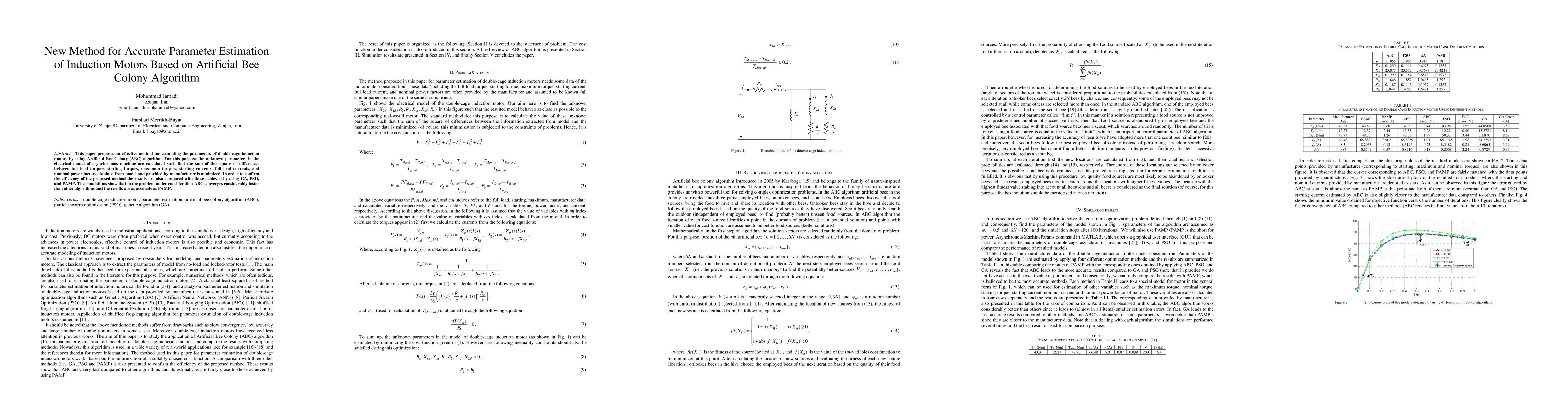 This paper introduces an Artificial Bee Colony (ABC) algorithm for estimating parameters of double-cage induction motors, achieving faster convergence and accuracy comparable to PAMP, while outperforming GA and PSO in simulations.