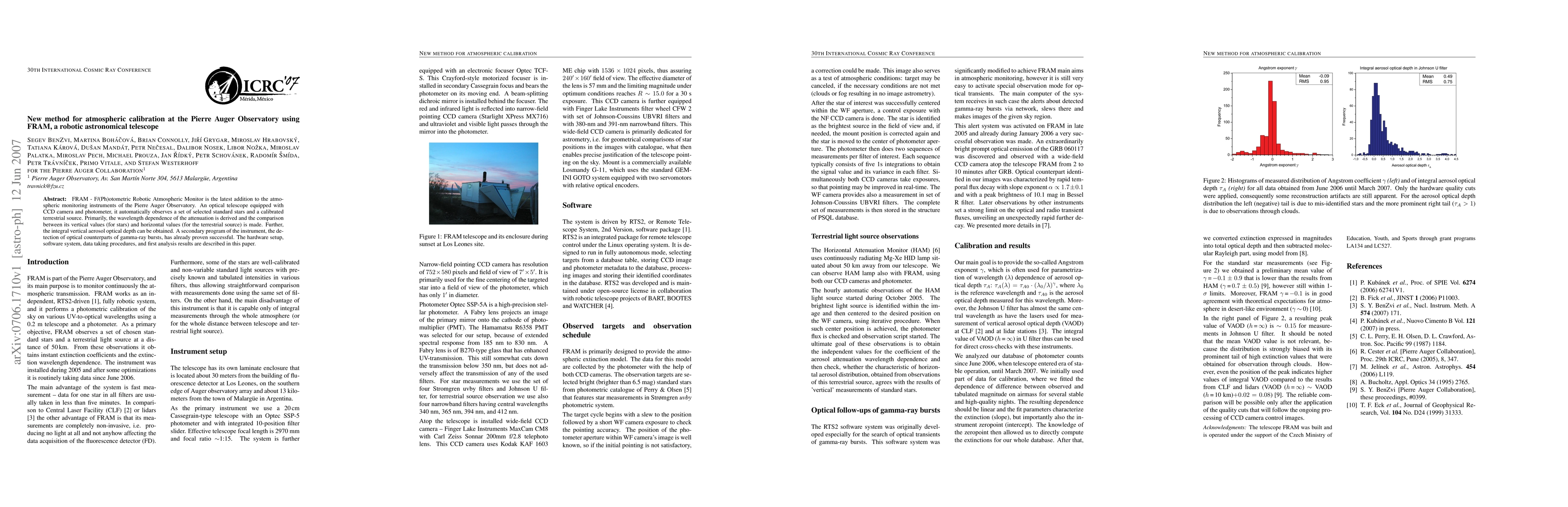 This paper introduces FRAM, a new robotic telescope at the Pierre Auger Observatory, designed for atmospheric calibration by observing standard stars and a terrestrial source. The method derives the wavelength dependence of atmospheric attenuation and measures the integral vertical aerosol optical depth, with initial successful results also reported in detecting gamma-ray burst optical counterparts.