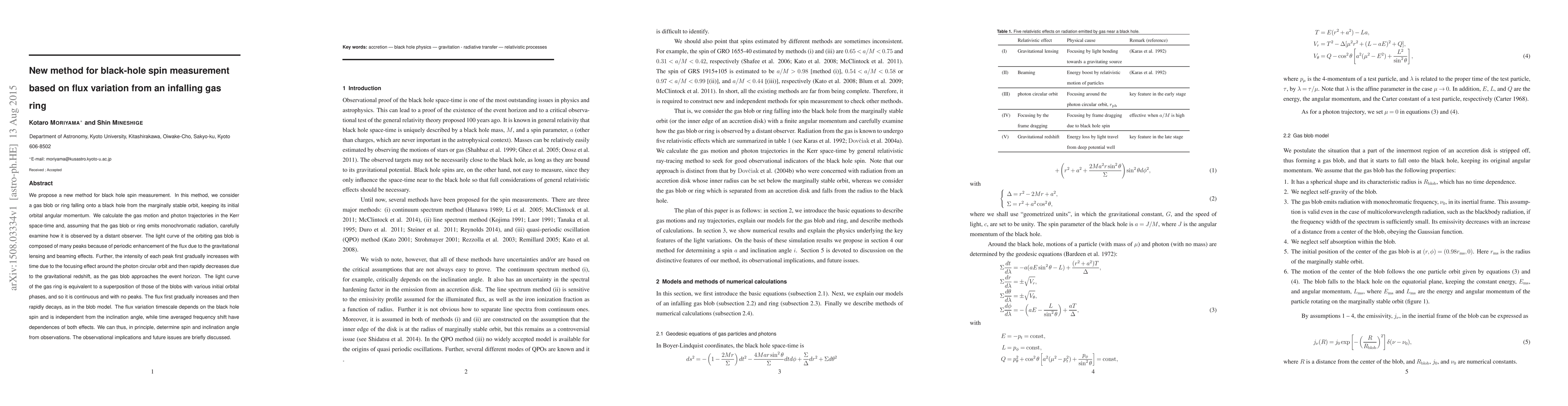 We propose a new method for black hole spin measurement. In this method, we consider a gas blob or ring falling onto a black hole from the marginally stable orbit, keeping its initial orbital angular momentum. We calculate the gas motion and photon trajectories in the Kerr space-time and, assuming that the gas blob or ring emits monochromatic radiation, carefully examine how it is observed by a distant observer. The light curve of the orbiting gas blob is composed of many peaks because of periodic enhancement of the flux due to the gravitational lensing and beaming effects. Further, the intensity of each peak first gradually increases with time due to the focusing effect around the photon circular orbit and then rapidly decreases due to the gravitational redshift, as the gas blob approaches the event horizon. The light curve of the gas ring is equivalent to a superposition of those of the blobs with various initial orbital phases, and so it is continuous and with no peaks. The flux first gradually increases and then rapidly decays, as in the blob model. The flux variation timescale depends on the black hole spin and is independent from the inclination angle, while time averaged frequency shift have dependences of both effects. We can thus, in principle, determine spin and inclination angle from observations. The observational implications and future issues are briefly discussed.