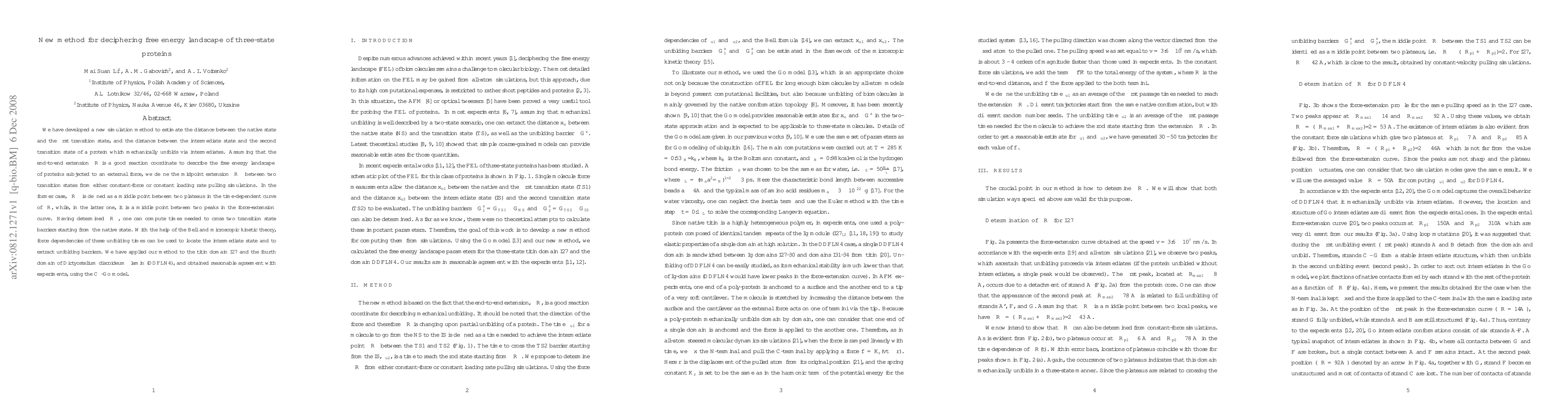 We have developed a new simulation method to estimate the distance between the native state and the first transition state, and the distance between the intermediate state and the second transition state of a protein which mechanically unfolds via intermediates. Assuming that the end-to-end extension $\Delta R$ is a good reaction coordinate to describe the free energy landscape of proteins subjected to an external force, we define the midpoint extension $\Delta R^*$ between two transition states from either constant-force or constant loading rate pulling simulations. In the former case, $\Delta R^*$ is defined as a middle point between two plateaus in the time-dependent curve of $\Delta R$, while, in the latter one, it is a middle point between two peaks in the force-extension curve. Having determined $\Delta R^*$, one can compute times needed to cross two transition state barriers starting from the native state. With the help of the Bell and microscopic kinetic theory, force dependencies of these unfolding times can be used to locate the intermediate state and to extract unfolding barriers. We have applied our method to the titin domain I27 and the fourth domain of {\em Dictyostelium discoideum} filamin (DDFLN4), and obtained reasonable agreement with experiments, using the C$_{\alpha}$-Go model.