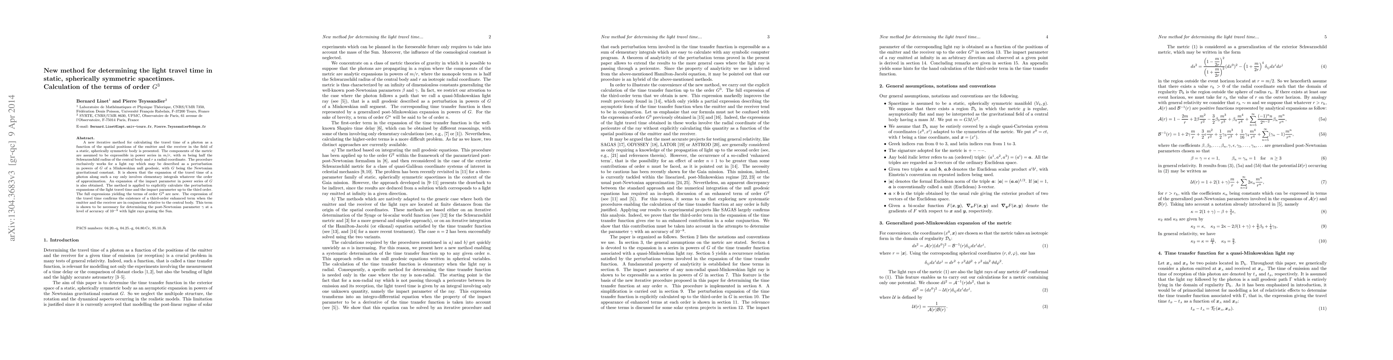 A new iterative method for calculating the travel time of a photon as a function of the spatial positions of the emitter and the receiver in the field of a static, spherically symmetric body is presented. The components of the metric are assumed to be expressible in power series in $m/r$, with $m$ being half the Schwarzschild radius of the central body and $r$ a radial coordinate. The procedure exclusively works for a light ray which may be described as a perturbation in powers of $G$ of a Minkowskian null geodesic, with $G$ being the Newtonian gravitational constant. It is shown that the expansion of the travel time of a photon along such a ray only involves elementary integrals whatever the order of approximation. An expansion of the impact parameter in power series of $G$ is also obtained. The method is applied to explicitly calculate the perturbation expansions of the light travel time and the impact parameter up to the third order. The full expressions yielding the terms of order $G^3$ are new. The expression of the travel time confirms the existence of a third-order enhanced term when the emitter and the receiver are in conjunction relative to the central body. This term is shown to be necessary for determining the post-Newtonian parameter $\gamma$ at a level of accuracy of $10^{-8}$ with light rays grazing the Sun.