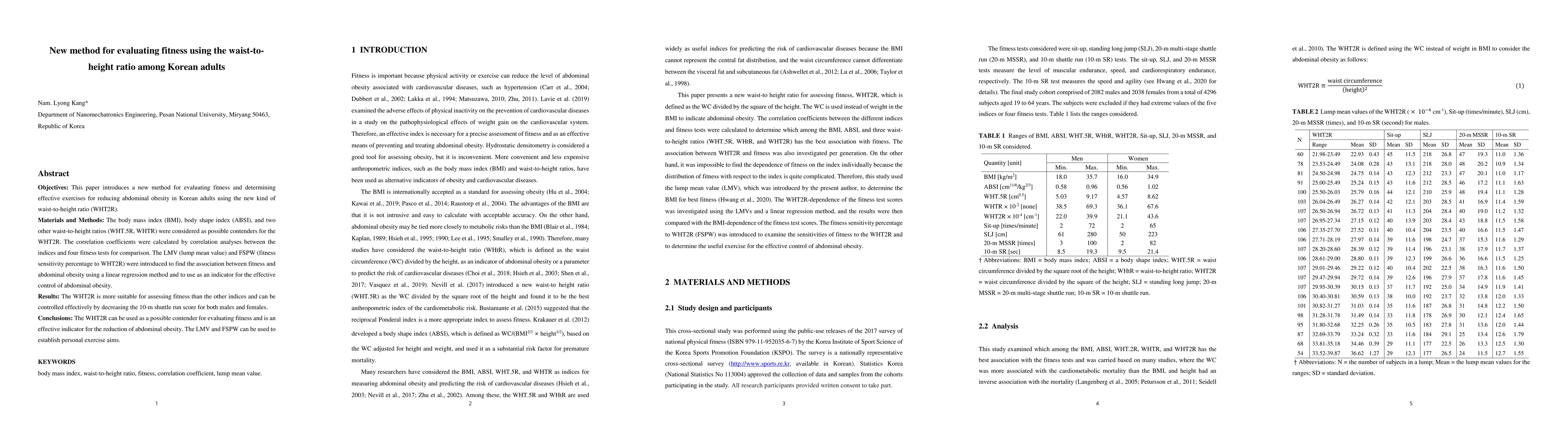 Objectives: This paper introduces a new method for evaluating fitness and determining effective exercises for reducing abdominal obesity in Korean adults using the new kind of waist-to-height ratio (WHT2R). Materials and Methods: The body mass index (BMI), body shape index (ABSI), and two other waist-to-height ratios (WHT.5R, WHTR) were considered as possible contenders for the WHT2R. The correlation coefficients were calculated by correlation analyses between the indices and four fitness tests for comparison. The LMV (lump mean value) and FSPW (fitness sensitivity percentage to WHT2R) were introduced to find the association between fitness and abdominal obesity using a linear regression method and to use as an indicator for the effective control of abdominal obesity. Results: The WHT2R is more suitable for assessing fitness than the other indices and can be controlled effectively by decreasing the 10-m shuttle run score for both males and females. Conclusions: The WHT2R can be used as a possible contender for evaluating fitness and is an effective indicator for the reduction of abdominal obesity. The LMV and FSPW can be used to establish personal exercise aims.