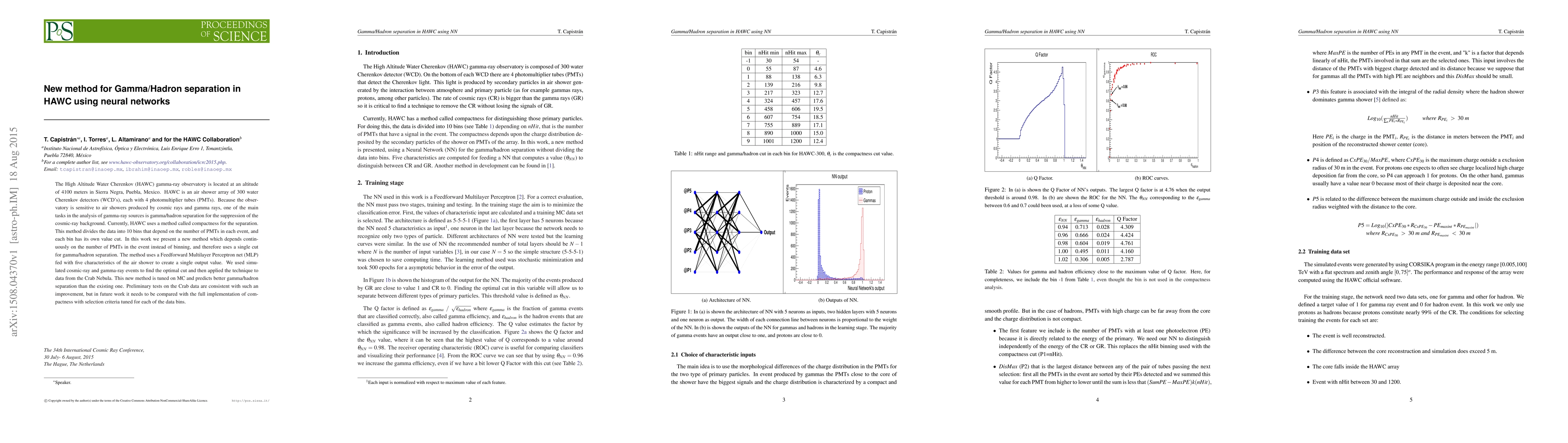 This paper introduces a new neural network-based method for gamma/hadron separation in the HAWC observatory, using a Feedforward Multilayer Perceptron net to process air shower characteristics. This method aims to improve upon the existing compactness method by providing a continuous separation instead of binning, showing preliminary success in data from the Crab Nebula.