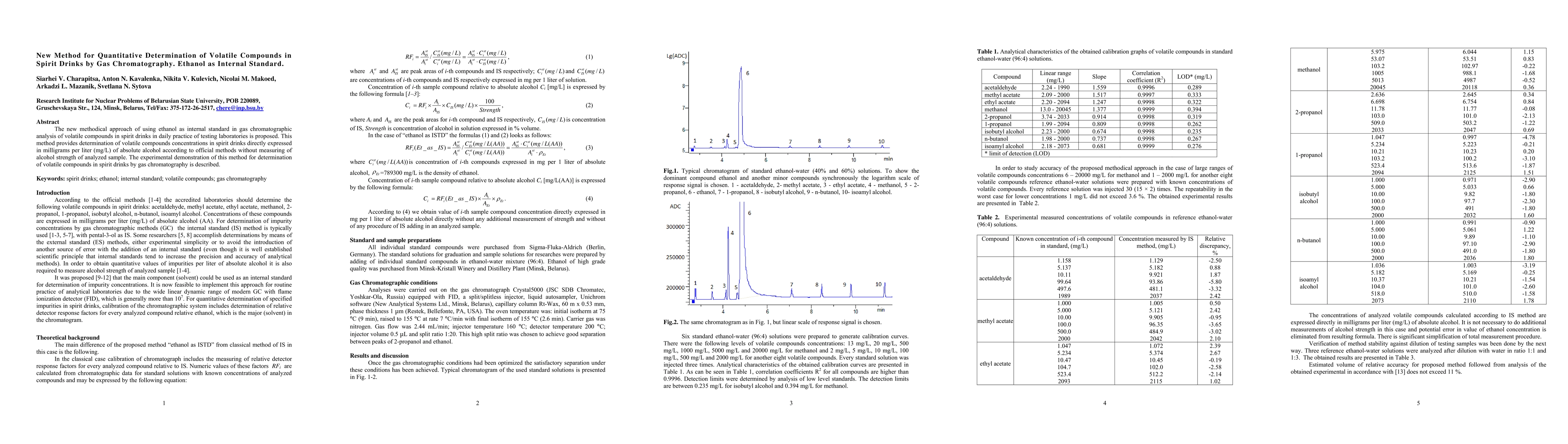This paper proposes a new gas chromatography method using ethanol as an internal standard to quantify volatile compounds in spirit drinks, directly expressing results in mg/L of absolute alcohol without measuring the sample's alcohol content. The method's effectiveness is experimentally demonstrated.