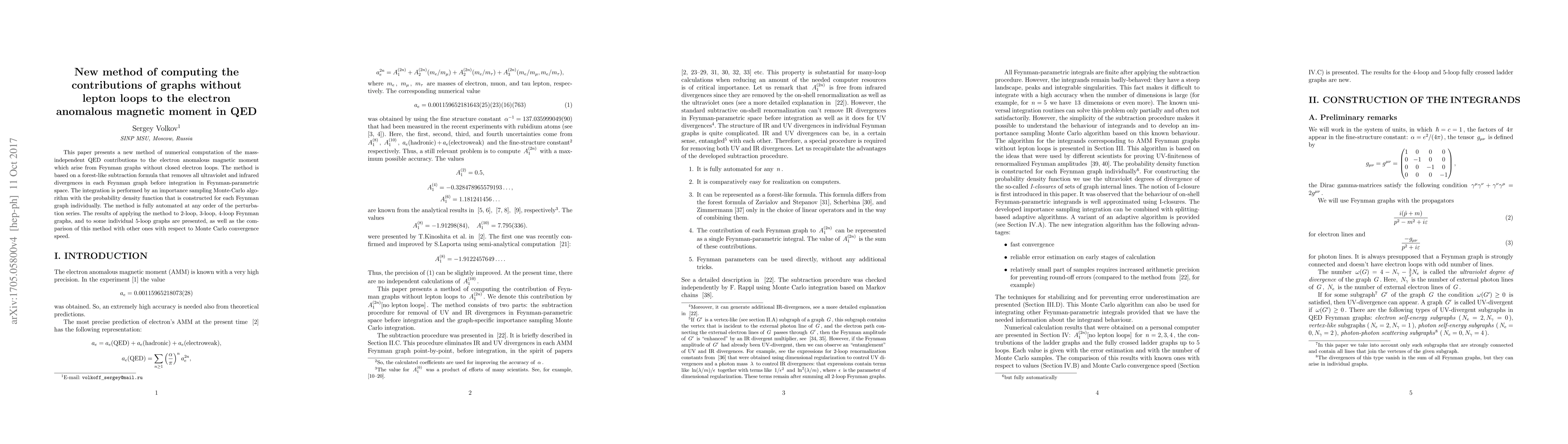 This paper introduces a novel method for numerically calculating QED contributions to electron's anomalous magnetic moment from graphs without electron loops. The method involves a forest-like subtraction formula to eliminate divergences and a tailored Monte-Carlo algorithm for each graph, fully automatable at any perturbation order. Results from 2-loop to 5-loop graphs are presented.
