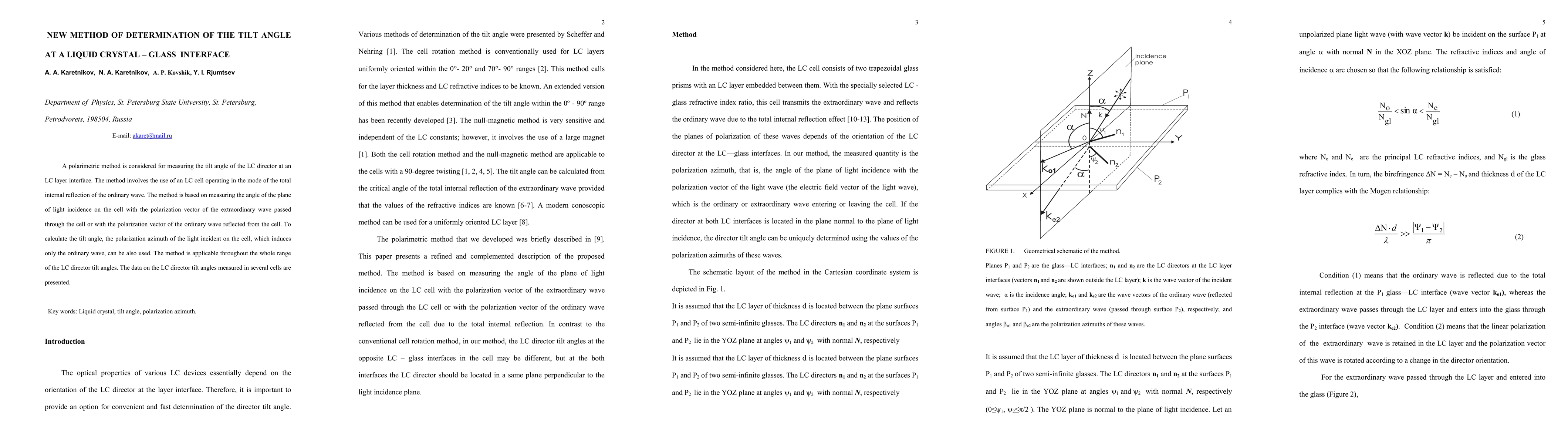 We propose a polarimetric method for measuring the tilt angle of the LC director at an LC layer interface.The method involves the use of an LC cell operating in the mode of the total internal reflection of the ordinary wave. The method is based on measuring the angle of the plane of light incidence on the cell with the polarization vector of the extraordinary wave passed through the cell or with the polarization vector of the ordinary wave reflected from the cell. To calculate the tilt angle, the polarization azimuth of the light incident on the cell, which induces only the ordinary wave, can be also used.The method is applicable throughout the whole range of the LC director tilt angles.