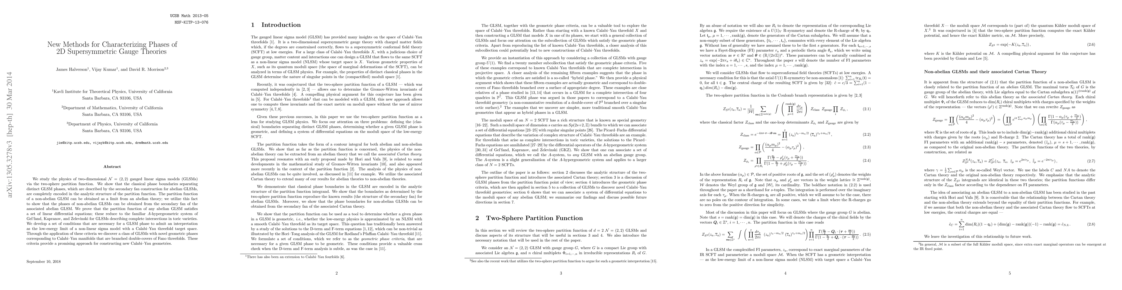 We study the physics of two-dimensional N=(2,2) gauged linear sigma models (GLSMs) via the two-sphere partition function. We show that the classical phase boundaries separating distinct GLSM phases, which are described by the secondary fan construction for abelian GLSMs, are completely encoded in the analytic structure of the partition function. The partition function of a non-abelian GLSM can be obtained as a limit from an abelian theory; we utilize this fact to show that the phases of non-abelian GLSMs can be obtained from the secondary fan of the associated abelian GLSM. We prove that the partition function of any abelian GLSM satisfies a set of linear differential equations; these reduce to the familiar A-hypergeometric system of Gel'fand, Kapranov, and Zelevinski for GLSMs describing complete intersections in toric varieties. We develop a set of conditions that are necessary for a GLSM phase to admit an interpretation as the low-energy limit of a non-linear sigma model with a Calabi-Yau threefold target space. Through the application of these criteria we discover a class of GLSMs with novel geometric phases corresponding to Calabi-Yau manifolds that are branched double-covers of Fano threefolds. These criteria provide a promising approach for constructing new Calabi-Yau geometries.