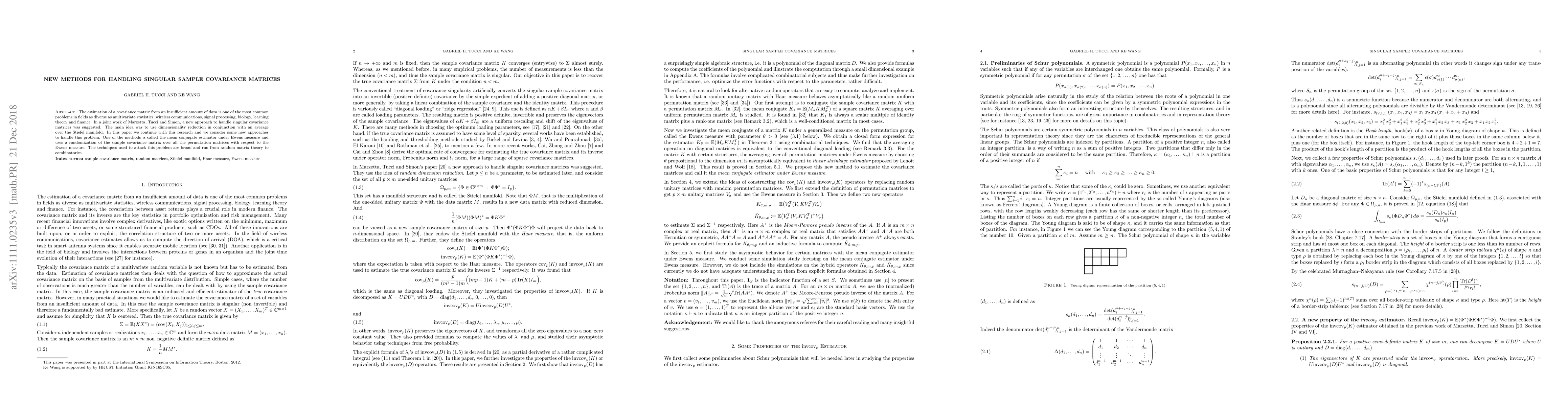 This paper proposes new methods for estimating singular sample covariance matrices, addressing the challenge of insufficient data. It introduces the Ewens estimator, which randomizes the sample covariance matrix using permutation matrices, and employs techniques from random matrix theory and combinatorics to tackle the problem.