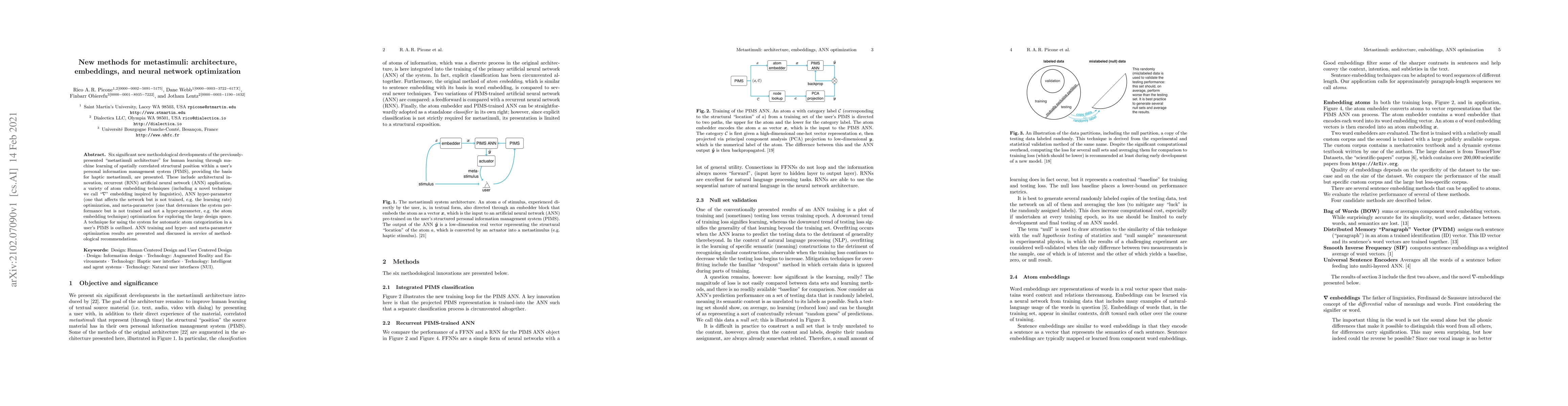 Six significant new methodological developments of the previously-presented "metastimuli architecture" for human learning through machine learning of spatially correlated structural position within a user's personal information management system (PIMS), providing the basis for haptic metastimuli, are presented. These include architectural innovation, recurrent (RNN) artificial neural network (ANN) application, a variety of atom embedding techniques (including a novel technique we call "nabla" embedding inspired by linguistics), ANN hyper-parameter (one that affects the network but is not trained, e.g. the learning rate) optimization, and meta-parameter (one that determines the system performance but is not trained and not a hyper-parameter, e.g. the atom embedding technique) optimization for exploring the large design space. A technique for using the system for automatic atom categorization in a user's PIMS is outlined. ANN training and hyper- and meta-parameter optimization results are presented and discussed in service of methodological recommendations.