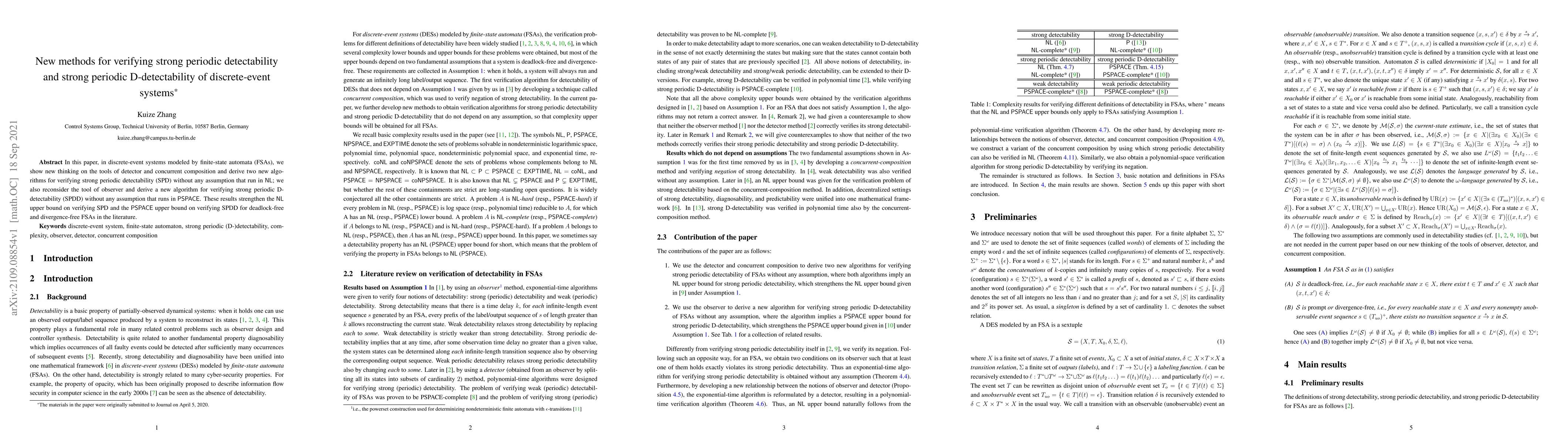 In this paper, in discrete-event systems modeled by finite-state automata (FSAs), we show new thinking on the tools of detector and concurrent composition and derive two new algorithms for verifying strong periodic detectability (SPD) without any assumption that run in NL; we also reconsider the tool of observer and derive a new algorithm for verifying strong periodic D- detectability (SPDD) without any assumption that runs in PSPACE. These results strengthen the NL upper bound on verifying SPD and the PSPACE upper bound on verifying SPDD for deadlock-free and divergence-free FSAs in the literature.