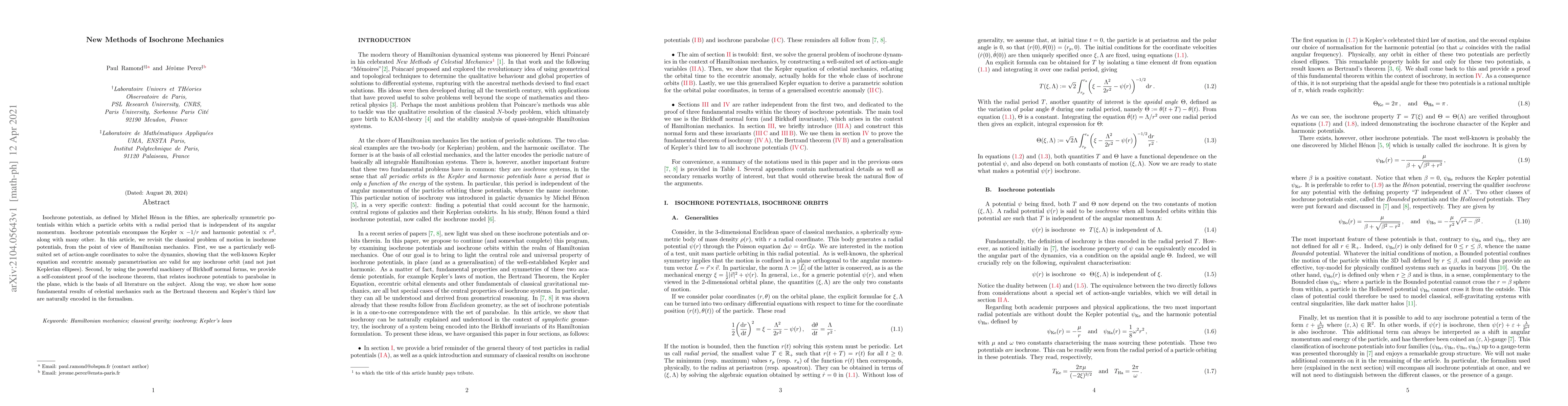 This paper revisits the dynamics of isochrone potentials using Hamiltonian mechanics, demonstrating that Kepler's equation and eccentric anomaly apply to all isochrone orbits. It also provides a proof of the isochrone theorem using Birkhoff normal forms and shows the natural encoding of fundamental celestial mechanics results.