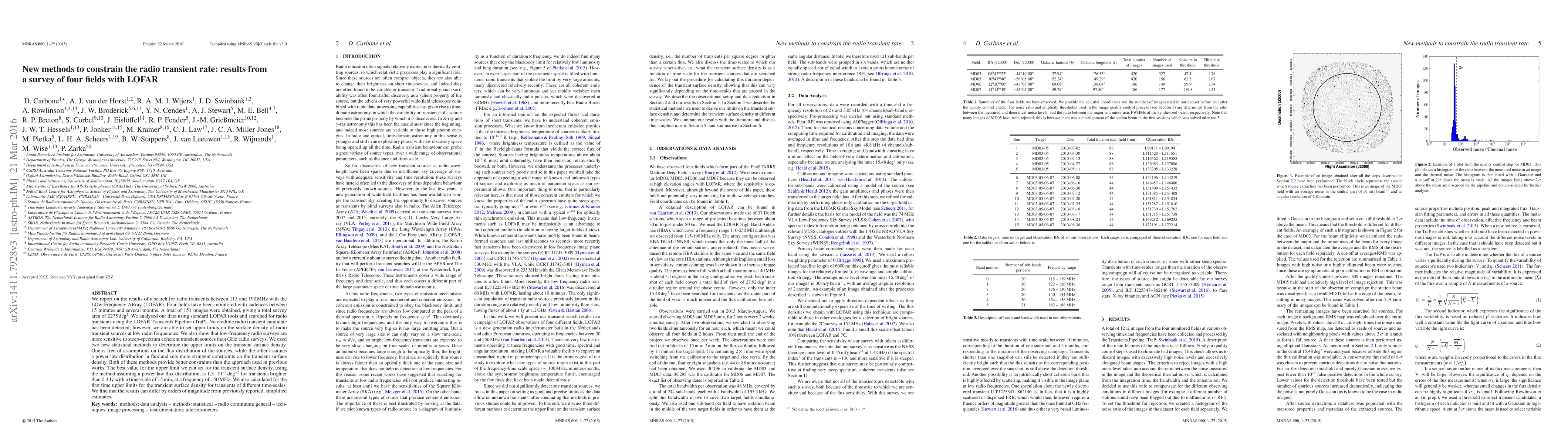We report on the results of a search for radio transients between 115 and 190\,MHz with the LOw-Frequency ARray (LOFAR). Four fields have been monitored with cadences between 15 minutes and several months. A total of 151 images were obtained, giving a total survey area of 2275 deg$^2$. We analysed our data using standard LOFAR tools and searched for radio transients using the LOFAR Transients Pipeline (TraP). No credible radio transient candidate has been detected; however, we are able to set upper limits on the surface density of radio transient sources at low radio frequencies. We also show that low-frequency radio surveys are more sensitive to steep-spectrum coherent transient sources than GHz radio surveys. We used two new statistical methods to determine the upper limits on the transient surface density. One is free of assumptions on the flux distribution of the sources, while the other assumes a power-law distribution in flux and sets more stringent constraints on the transient surface density. Both of these methods provide better constraints than the approach used in previous works. The best value for the upper limit we can set for the transient surface density, using the method assuming a power-law flux distribution, is 1.3$\cdot$10$^{-3}$ deg$^{-2}$ for transients brighter than 0.3 Jy with a time-scale of 15 min, at a frequency of 150 MHz. We also calculated for the first time upper limits for the transient surface density for transients of different time-scales. We find that the results can differ by orders of magnitude from previously reported, simplified estimates.