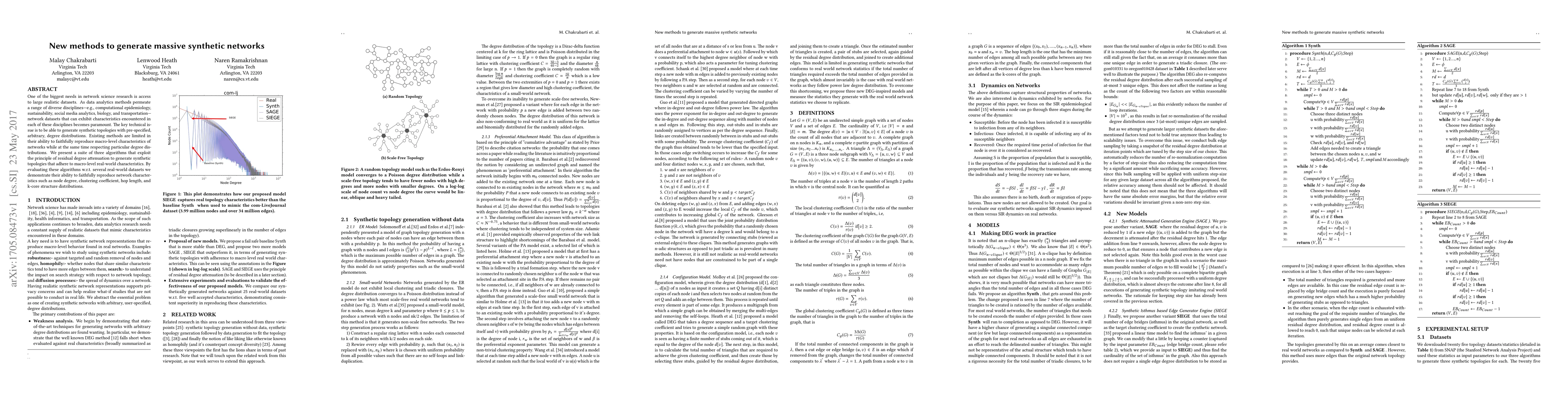 One of the biggest needs in network science research is access to large realistic datasets. As data analytics methods permeate a range of diverse disciplines---e.g., computational epidemiology, sustainability, social media analytics, biology, and transportation--- network datasets that can exhibit characteristics encountered in each of these disciplines becomes paramount. The key technical issue is to be able to generate synthetic topologies with pre-specified, arbitrary, degree distributions. Existing methods are limited in their ability to faithfully reproduce macro-level characteristics of networks while at the same time respecting particular degree distributions. We present a suite of three algorithms that exploit the principle of residual degree attenuation to generate synthetic topologies that adhere to macro-level real-world characteristics. By evaluating these algorithms w.r.t. several real-world datasets we demonstrate their ability to faithfully reproduce network characteristics such as node degree, clustering coefficient, hop length, and k-core structure distributions.