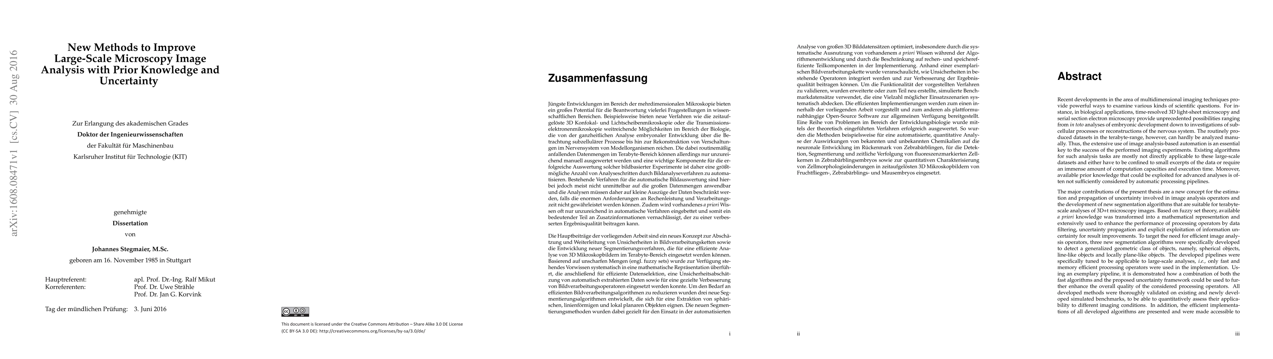 Multidimensional imaging techniques provide powerful ways to examine various kinds of scientific questions. The routinely produced datasets in the terabyte-range, however, can hardly be analyzed manually and require an extensive use of automated image analysis. The present thesis introduces a new concept for the estimation and propagation of uncertainty involved in image analysis operators and new segmentation algorithms that are suitable for terabyte-scale analyses of 3D+t microscopy images.