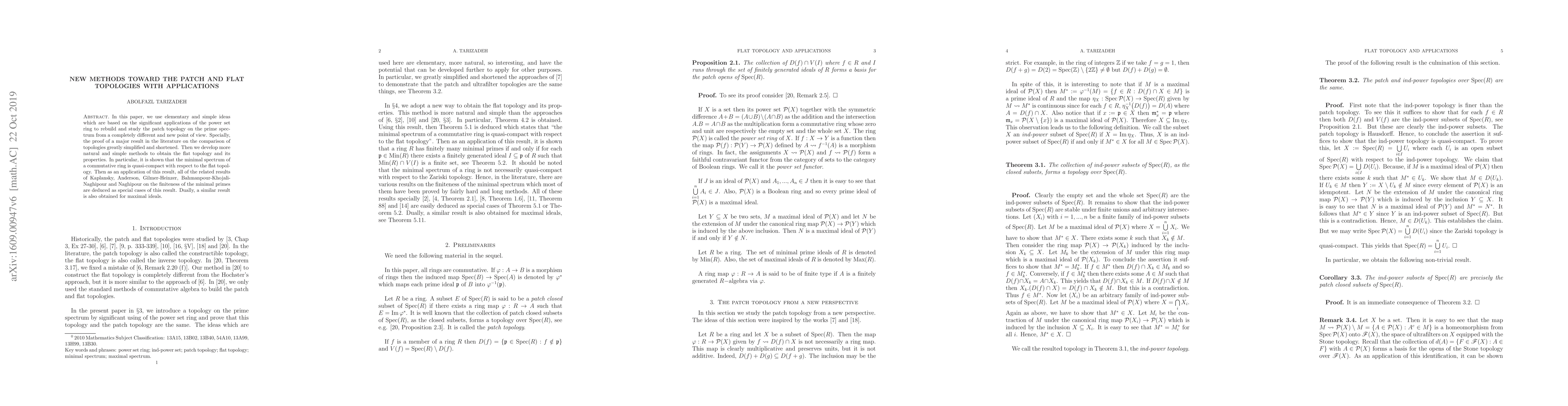 In this paper, we use elementary and simple ideas which are based on the significant applications of the power set ring to rebuild and study the patch topology on the prime spectrum from a completely different and new point of view. Specially, the proof of a major result in the literature on the comparison of topologies greatly simplified and shortened. Then we develop more natural and simple methods to obtain the flat topology and its properties. In particular, it is shown that the minimal spectrum of a commutative ring is quasi-compact with respect to the flat topology. Then as an application of this result, all of the related results of Kaplansky, Anderson, Gilmer-Heinzer, Bahmanpour-Khojali-Naghipour and Naghipour on the finiteness of the minimal primes are deduced as special cases of this result. Dually, a similar result is also obtained for maximal ideals.