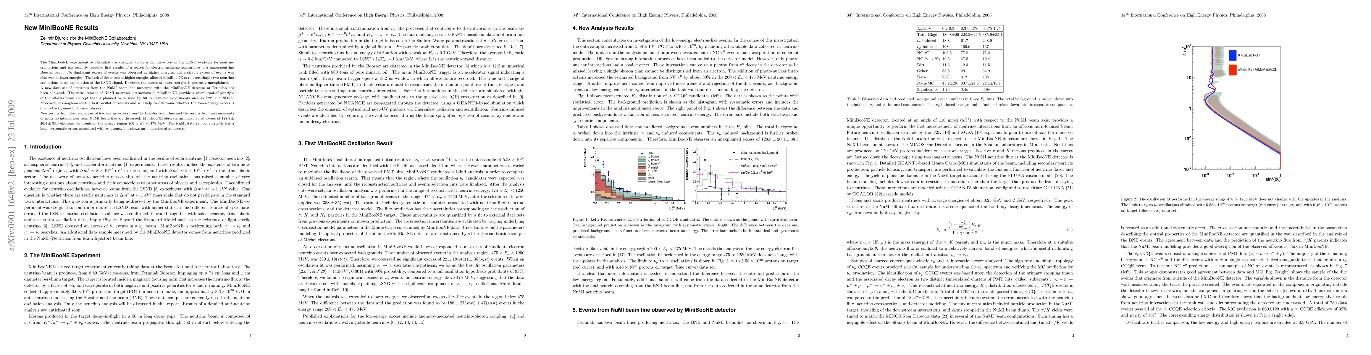 The MiniBooNE experiment at Fermilab was designed to be a definitive test of the LSND evidence for neutrino oscillations and has recently reported first results of a search for electron-neutrino appearance in a muon-neutrino Booster beam. No significant excess of events was observed at higher energies, but a sizable excess of events was observed at lower energies. The lack of the excess at higher energies allowed MiniBooNE to rule out simple two-neutrino oscillations as an explanation of the LSND signal. However, the excess at lower energies is presently unexplained. A new data set of neutrinos from the NuMI beam line measured with the MiniBooNE detector at Fermilab has been analyzed. The measurement of NuMI neutrino interactions in MiniBooNE provide a clear proof-of-principle of the off-axis beam concept that is planned to be used by future neutrino experiments such as T2K and NOvA. Moreover, it complements the first oscillation results and will help to determine whether the lower-energy excess is due to background or to new physics. New results from the re-analysis of low energy excess from the Booster beam line and the results from measurements of neutrino interactions from NuMI beam line are discussed. MiniBooNE observes an unexplained excess of $128.8 \pm 20.4 \pm 38.3$ electron-like events in the energy region $200 < E_{\nu} < 475$ MeV. The NuMI data sample currently has a large systematic errors associated with $\nu_{e}$ events, but shows an indication of an excess.