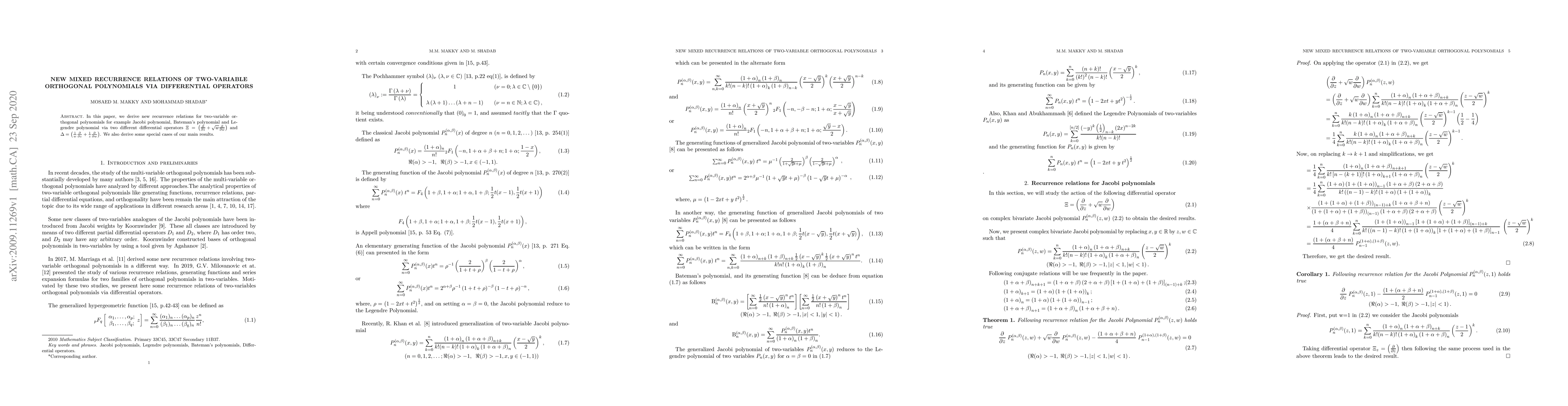This paper introduces new mixed recurrence relations for two-variable orthogonal polynomials, including Jacobi, Bateman's, and Legendre polynomials, using two differential operators $\Xi$ and $\Delta$. It also explores special cases of these derived relations.
