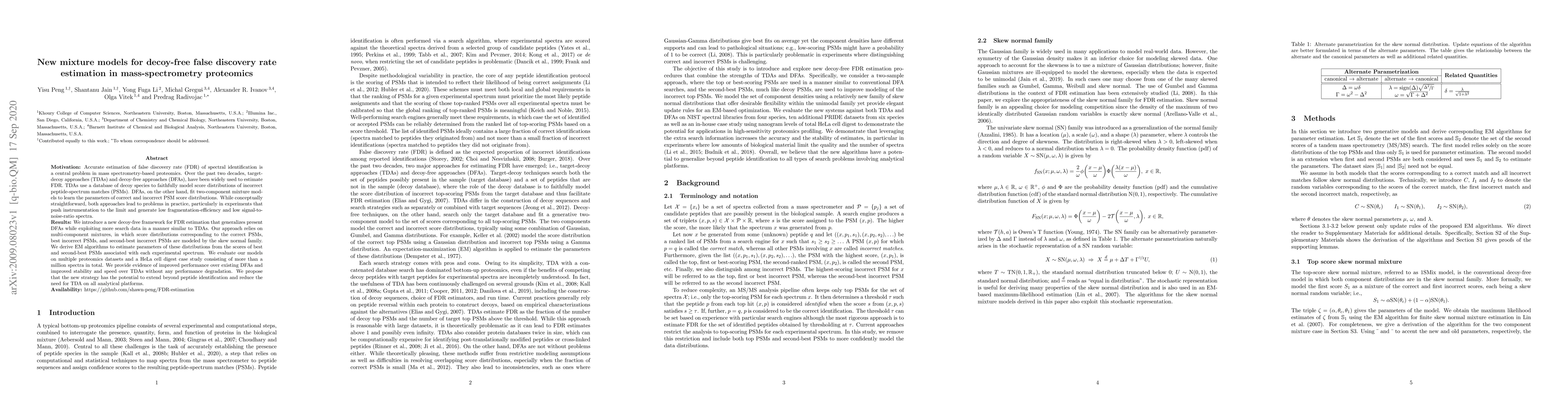 Motivation: Accurate estimation of false discovery rate (FDR) of spectral identification is a central problem in mass spectrometry-based proteomics. Over the past two decades, target decoy approaches (TDAs) and decoy-free approaches (DFAs), have been widely used to estimate FDR. TDAs use a database of decoy species to faithfully model score distributions of incorrect peptide-spectrum matches (PSMs). DFAs, on the other hand, fit two-component mixture models to learn the parameters of correct and incorrect PSM score distributions. While conceptually straightforward, both approaches lead to problems in practice, particularly in experiments that push instrumentation to the limit and generate low fragmentation-efficiency and low signal-to-noise-ratio spectra. Results: We introduce a new decoy-free framework for FDR estimation that generalizes present DFAs while exploiting more search data in a manner similar to TDAs. Our approach relies on multi-component mixtures, in which score distributions corresponding to the correct PSMs, best incorrect PSMs, and second-best incorrect PSMs are modeled by the skew normal family. We derive EM algorithms to estimate parameters of these distributions from the scores of best and second-best PSMs associated with each experimental spectrum. We evaluate our models on multiple proteomics datasets and a HeLa cell digest case study consisting of more than a million spectra in total. We provide evidence of improved performance over existing DFAs and improved stability and speed over TDAs without any performance degradation. We propose that the new strategy has the potential to extend beyond peptide identification and reduce the need for TDA on all analytical platforms.