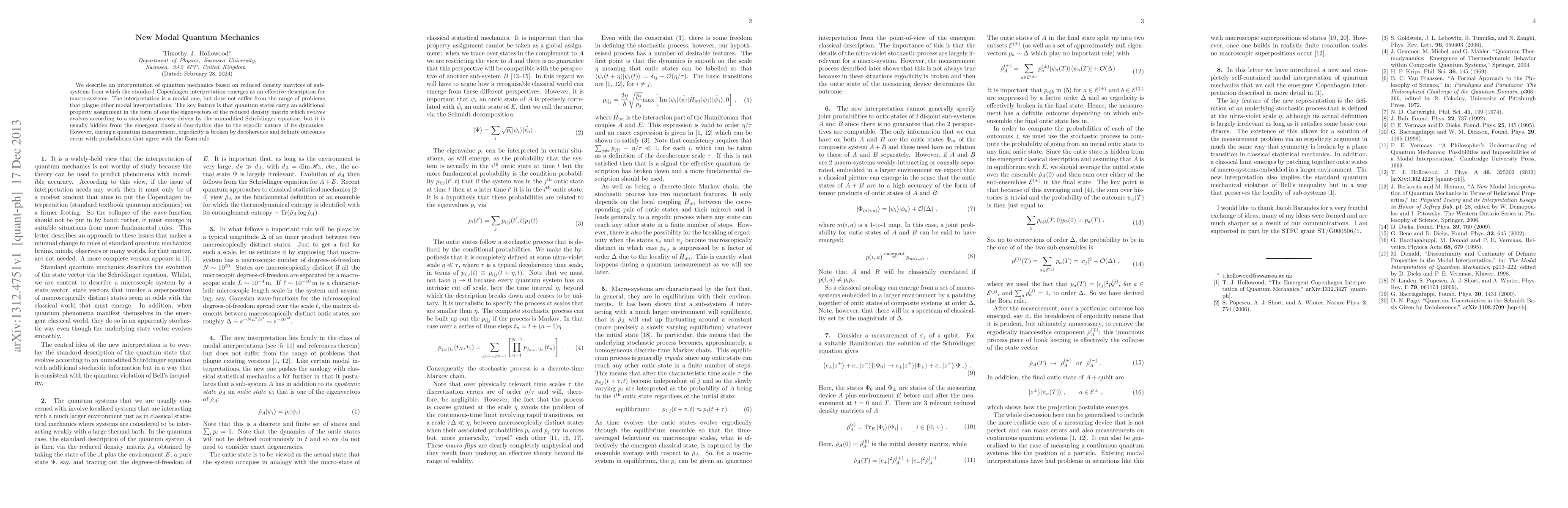 We describe an interpretation of quantum mechanics based on reduced density matrices of sub-systems from which the standard Copenhagen interpretation emerges as an effective description for macro-systems. The interpretation is a modal one, but does not suffer from the range of problems that plague other modal interpretations. The key feature is that quantum states carry an additional property assignment in the form of one the eigenvectors of the reduced density matrix which evolves evolves according to a stochastic process driven by the unmodified Schrodinger equation, but it is usually hidden from the emergent classical description due to the ergodic nature of its dynamics. However, during a quantum measurement, ergodicity is broken by decoherence and definite outcomes occur with probabilities that agree with the Born rule.
