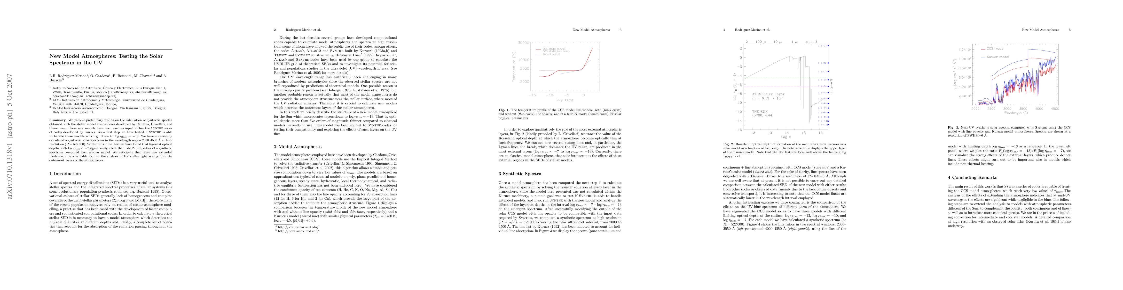The paper introduces new stellar model atmospheres, successfully tested with SYNTHE codes to generate a high-resolution synthetic solar spectrum (R=522,000) from 2000-4500 Angstroms. Key finding: layers with log tau(Ross) < -7 significantly impact mid-UV properties, suggesting these models will be valuable for analyzing UV stellar light from outer atmospheric layers.