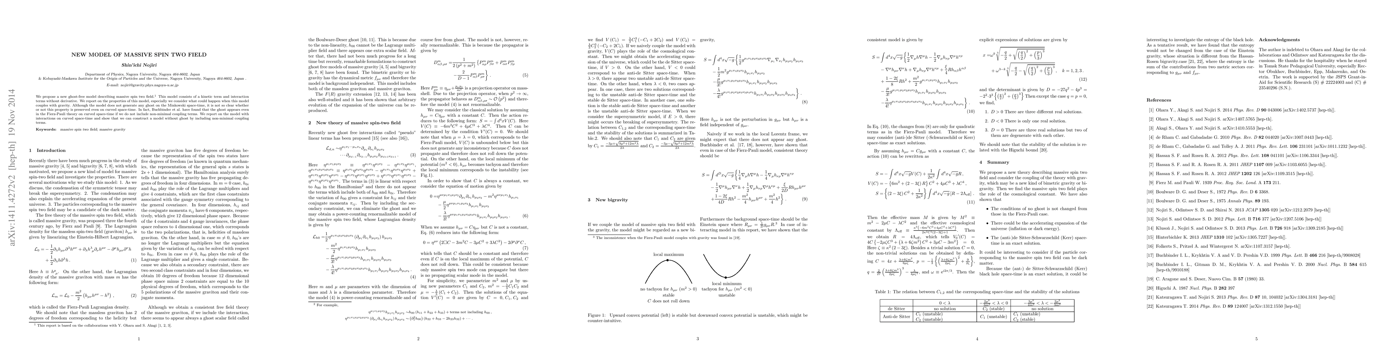 Researchers propose a new model of massive spin two fields that avoids ghosts in Minkowski space-time but may still introduce them on curved space-time; they find that adding non-minimal coupling terms can resolve this issue.