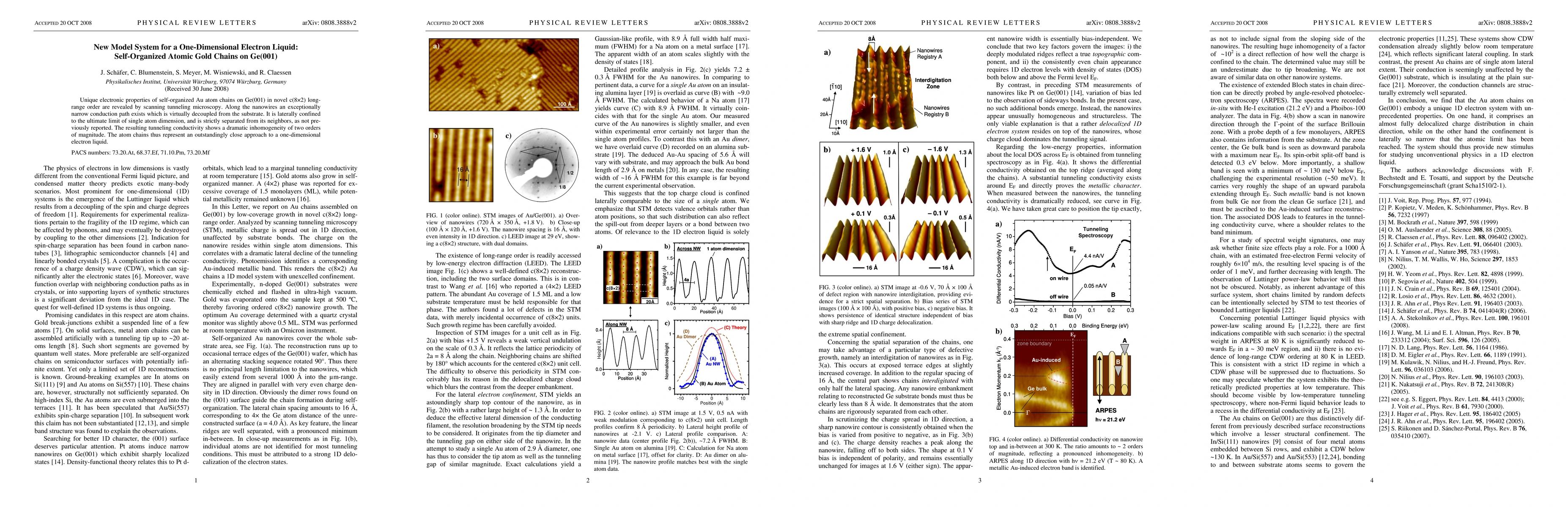 Unique electronic properties of self-organized Au atom chains on Ge(001) in novel c(8x2) long-range order are revealed by scanning tunneling microscopy. Along the nanowires an exceptionally narrow conduction path exists which is virtually decoupled from the substrate. It is laterally confined to the ultimate limit of single atom dimension, and is strictly separated from its neighbors, as not previously reported. The resulting tunneling conductivity shows a dramatic inhomogeneity of two orders of magnitude. The atom chains thus represent an outstandingly close approach to a one-dimensional electron liquid.