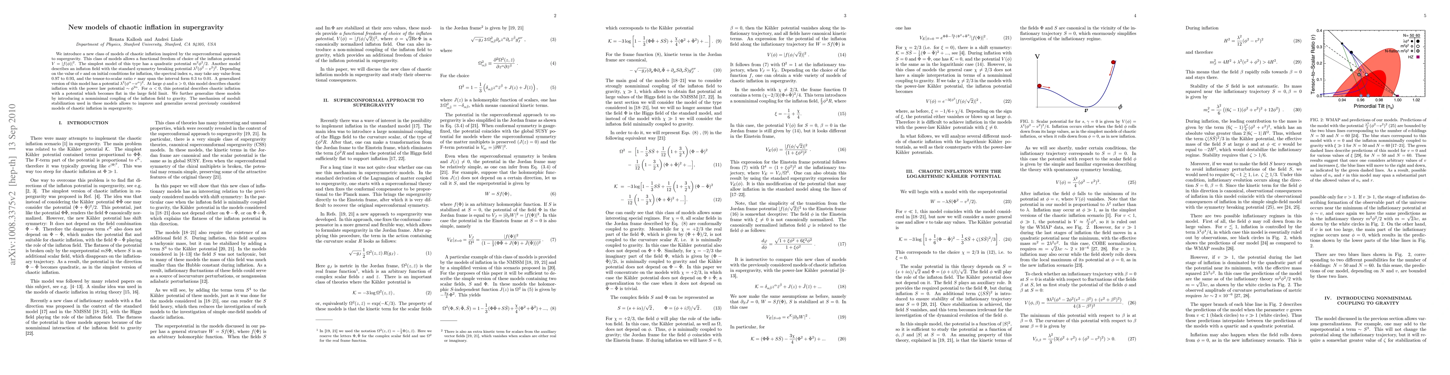 We introduce a new class of models of chaotic inflation inspired by the superconformal approach to supergravity. This class of models allows a functional freedom of choice of the inflaton potential V = |f(\phi)|^2. The simplest model of this type has a quadratic potential m^2\phi^2/2. Another model describes an inflaton field with the standard symmetry breaking potential \lambda^2 (\phi^2-v^2)^2. Depending on the value of v and on initial conditions for inflation, the spectral index n_s may take any value from 0.97 to 0.93, and the tensor-to-scalar ratio r may span the interval form 0.3 to 0.01. A generalized version of this model has a potential \lambda^2 (\phi^\alpha-v^\alpha)^2. At large \phi and \alpha > 0, this model describes chaotic inflation with the power law potential \phi^{2\alpha}. For \alpha < 0, this potential describes chaotic inflation with a potential which becomes flat in the large field limit. We further generalize these models by introducing a nonminimal coupling of the inflaton field to gravity. The mechanism of moduli stabilization used in these models allows to improve and generalize several previously considered models of chaotic inflation in supergravity.