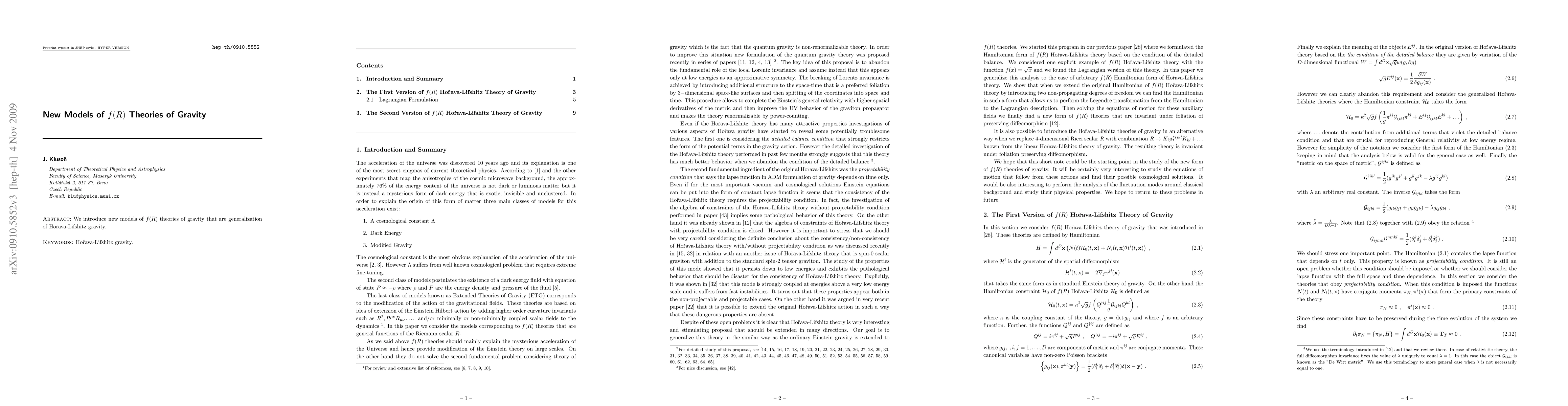 The paper presents a detailed Hamiltonian analysis of f(R) theories of gravity, incorporating second-class constraints and demonstrating a new class of models that generalize Horava-Lifshitz gravity.
