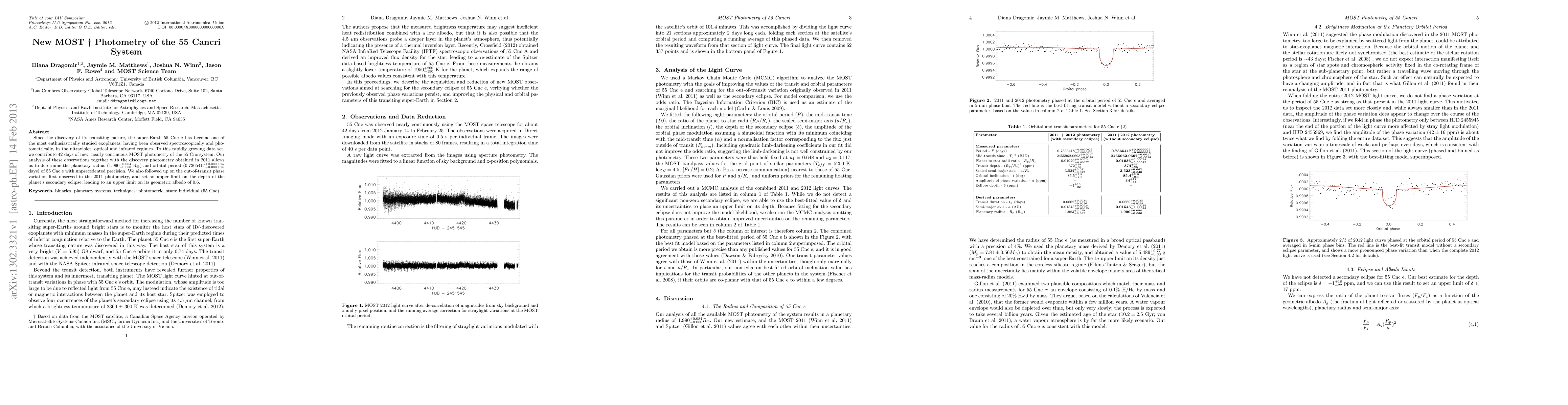 This paper presents new MOST photometry of the 55 Cancri system, determining the precise radius and orbital period of the exoplanet 55 Cnc e, and provides an upper limit on its geometric albedo based on secondary eclipse observations.