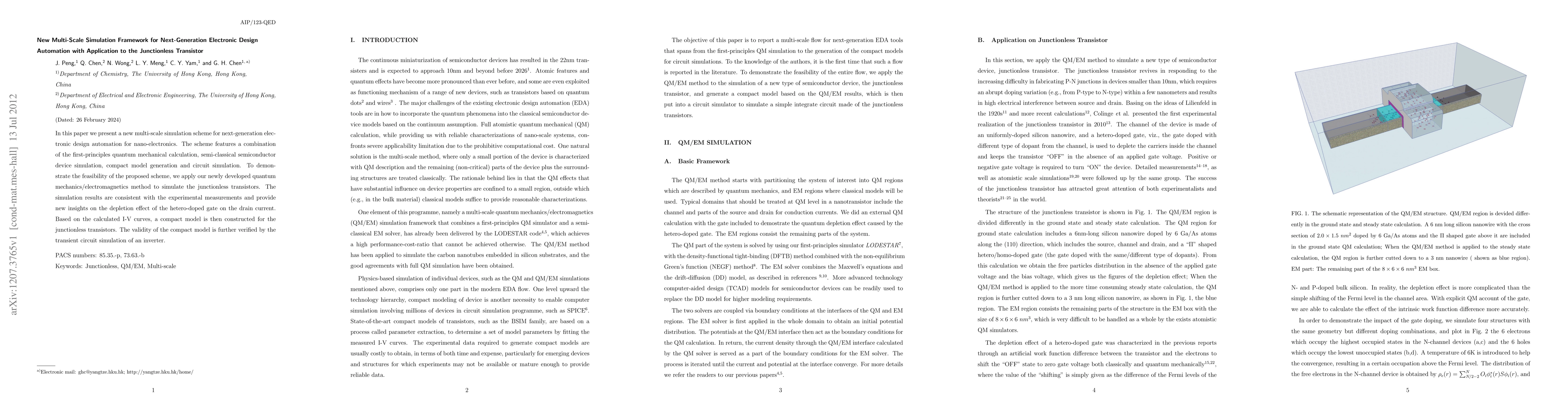 In this paper we present a new multi-scale simulation scheme for next-generation electronic design automation for nano-electronics. The scheme features a combination of the first-principles quantum mechanical calculation, semi-classical semiconductor device simulation, compact model generation and circuit simulation. To demonstrate the feasibility of the proposed scheme, we apply our newly developed quantum mechanics/electromagnetics method to simulate the junctionless transistors. The simulation results are consistent with the experimental measurements and provide new insights on the depletion effect of the hetero-doped gate on the drain current. Based on the calculated I-V curves, a compact model is then constructed for the junctionless transistors. The validity of the compact model is further verified by the transient circuit simulation of an inverter.