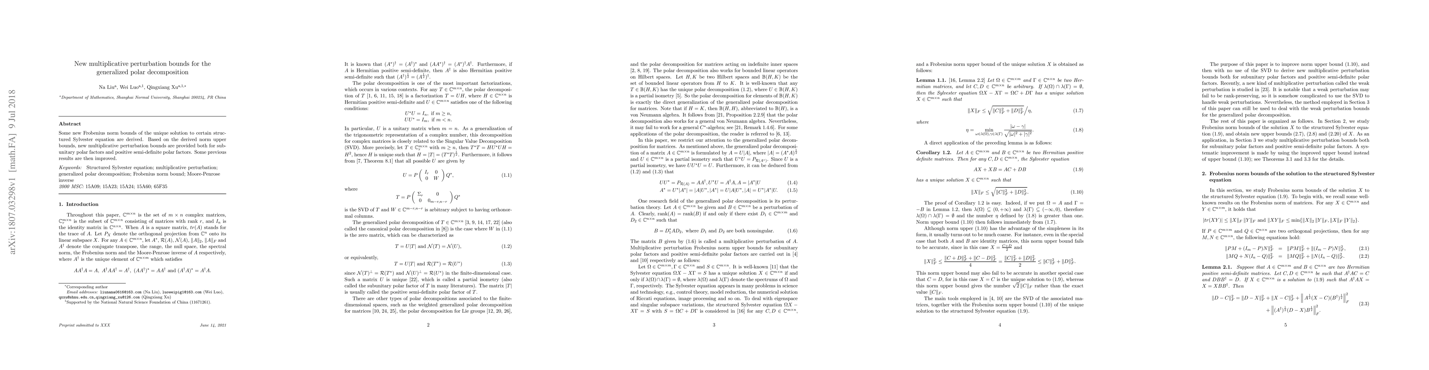 Some new Frobenius norm bounds of the unique solution to certain structured Sylvester equation are derived. Based on the derived norm upper bounds, new multiplicative perturbation bounds are provided both for subunitary polar factors and positive semi-definite polar factors. Some previous results are then improved.