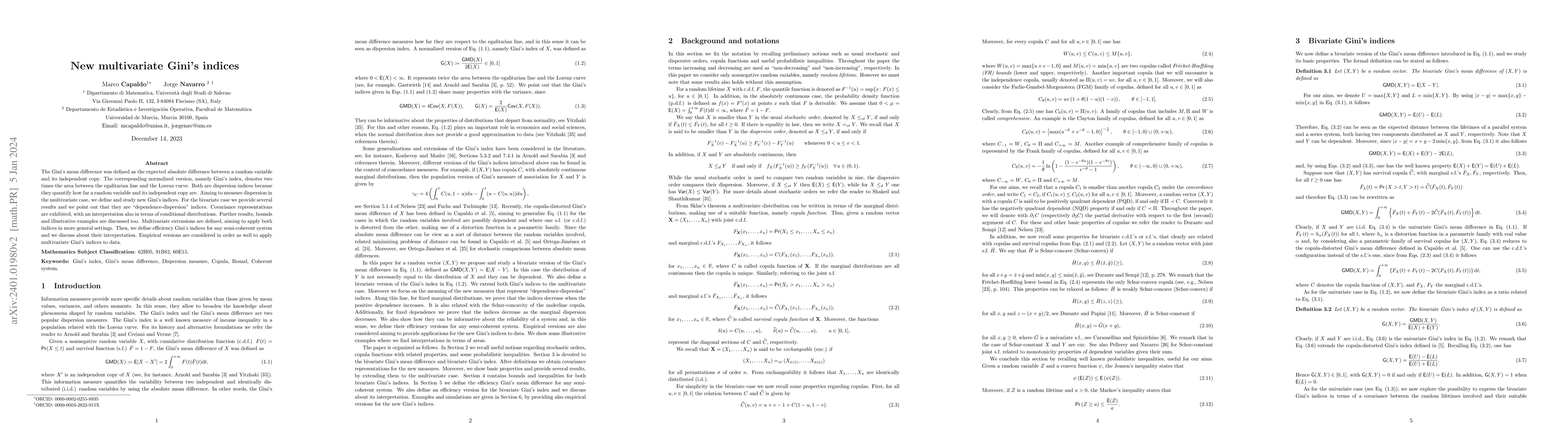 This paper introduces new multivariate versions of Gini's indices, aiming to measure dispersion in multivariate data. It provides detailed results for the bivariate case, including covariance representations and interpretations in terms of conditional distributions, and extends these indices to more general settings for semi-coherent systems.