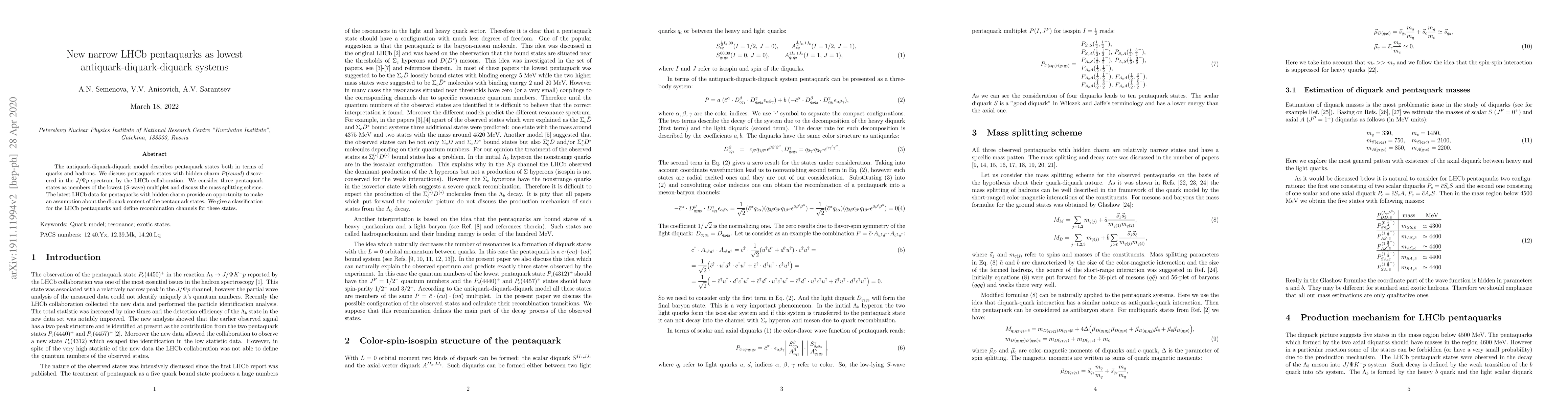 The antiquark-diquark-diquark model describes pentaquark states both in terms of quarks and hadrons. We discuss pentaquark states with hidden charm $P(\bar c cuud)$ discovered in the $J/\Psi p$ spectrum by the LHCb collaboration. We consider three pentaquark states as members of the lowest ($S$-wave) multiplet and discuss the mass splitting scheme. The latest LHCb data for pentaquarks with hidden charm provide an opportunity to make an assumption about the diquark content of the pentaquark states. We give a classification for the LHCb pentaquarks and define recombination channels for these states.