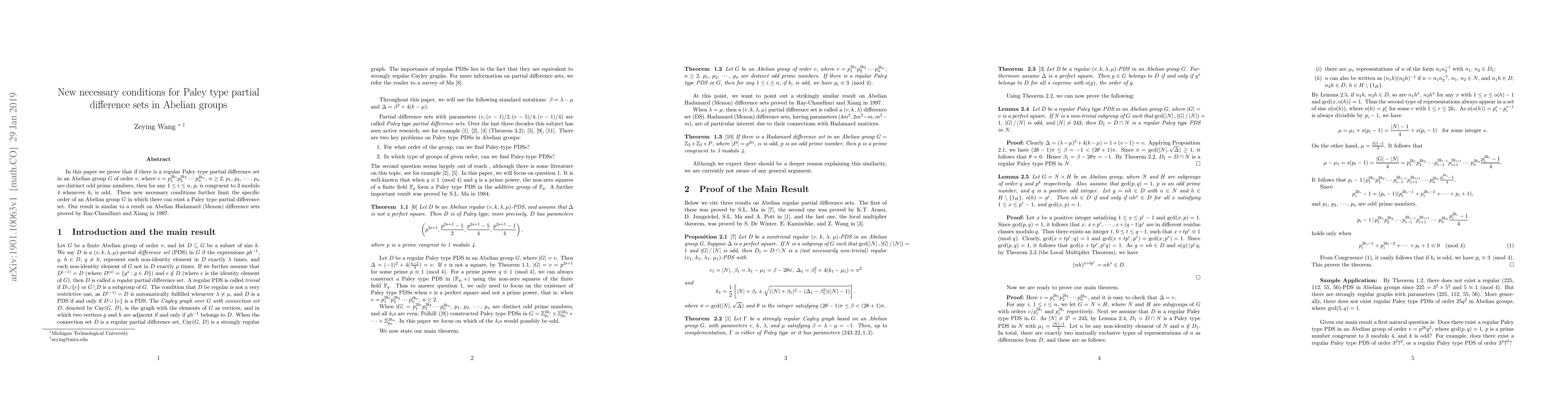 Researchers found new conditions necessary for Paley type partial difference sets in Abelian groups, limiting their order based on prime numbers modulo 4. This discovery restricts the existence of these sets to specific group orders, building upon earlier work.