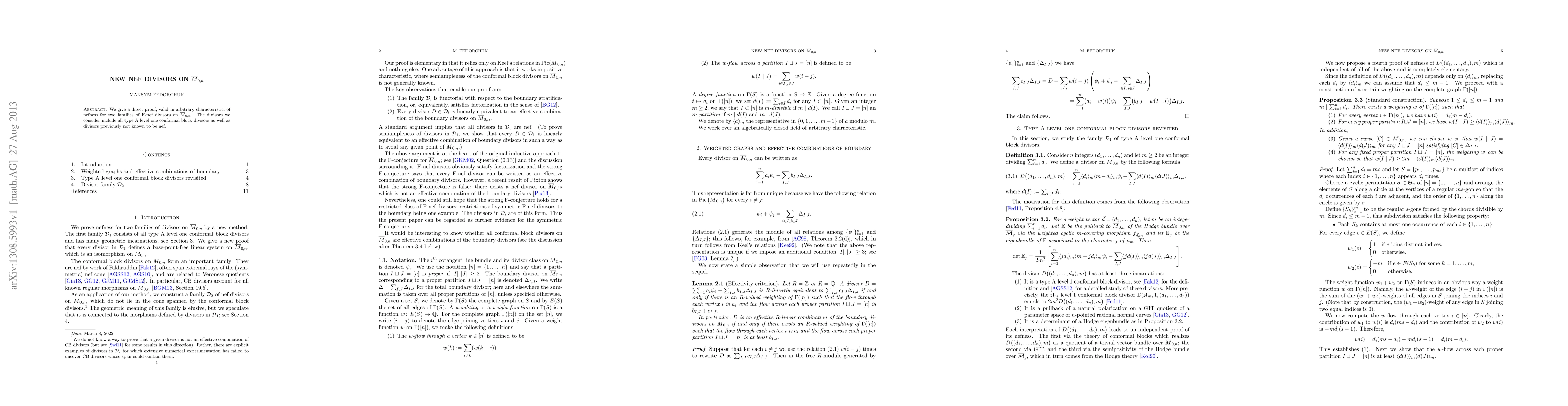 We give a direct proof, valid in arbitrary characteristic, of nefness for two families of F-nef divisors on $\bar{M}_{0,n}$. The divisors we consider include all type A level one conformal block divisors as well as divisors previously not known to be nef.