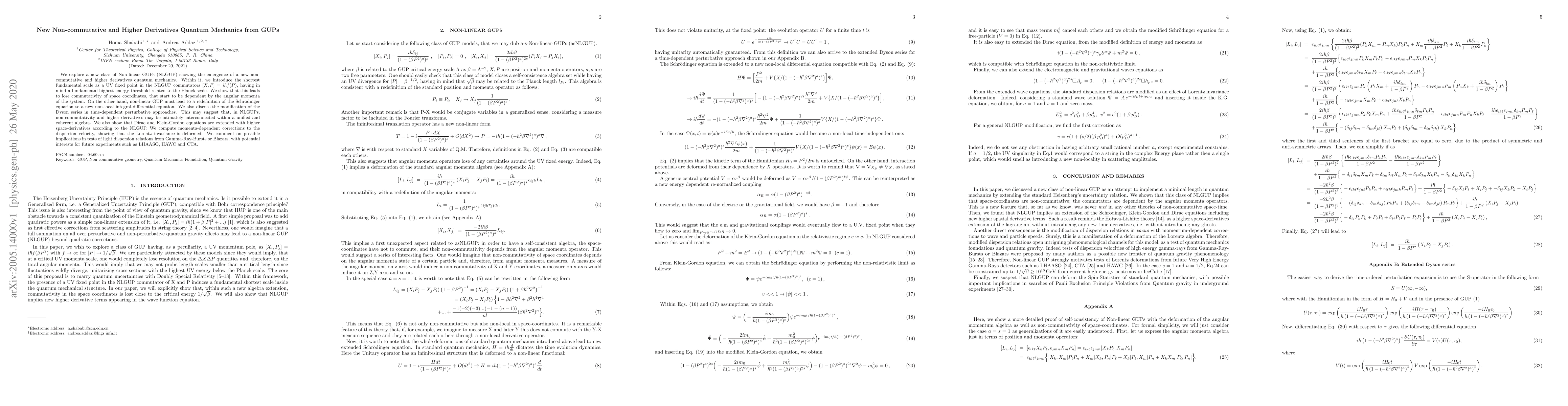 The research introduces Non-linear Generalized Uncertainty Principles (NLGUP) leading to non-commutative spaces where coordinates depend on angular momenta, and modifies the Schrödinger equation to a non-local integral-differential form. It also extends Dirac and Klein-Gordon equations with higher space-derivatives, deforming Lorentz invariance. Implications for tests of light dispersion relations from Gamma-Ray-Bursts or Blazars, with relevance for future experiments like LHAASO, HAWC, and CTA, are discussed.