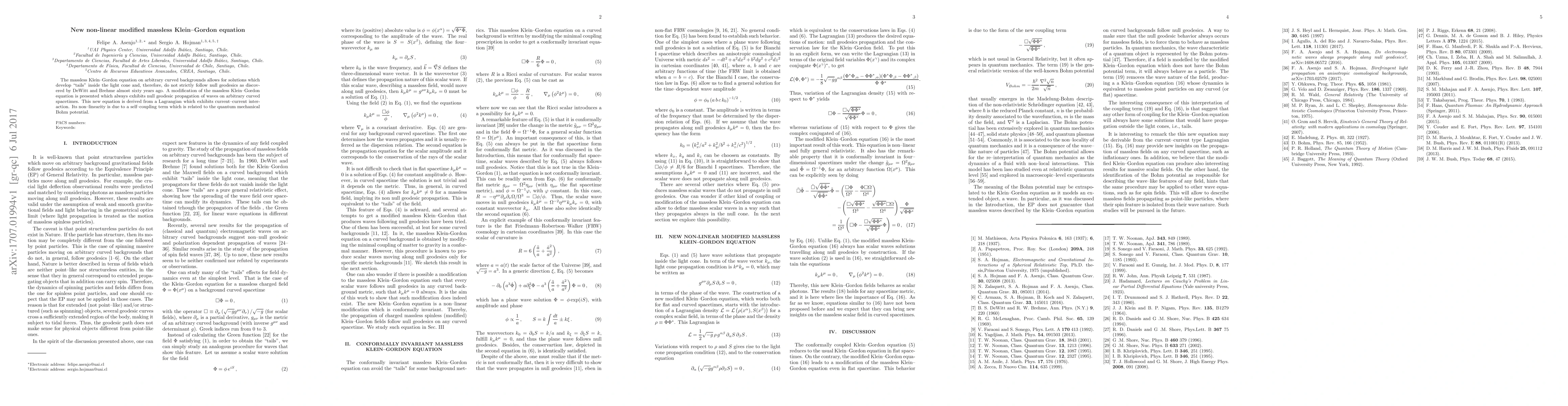 This paper proposes a modified massless Klein-Gordon equation that ensures wave propagation follows null geodesics on curved spacetimes, addressing the issue of "tails" in the original equation. The new non-linear equation is derived from a Lagrangian incorporating current-current interaction and a self-coupling term linked to the quantum mechanical Bohm potential.
