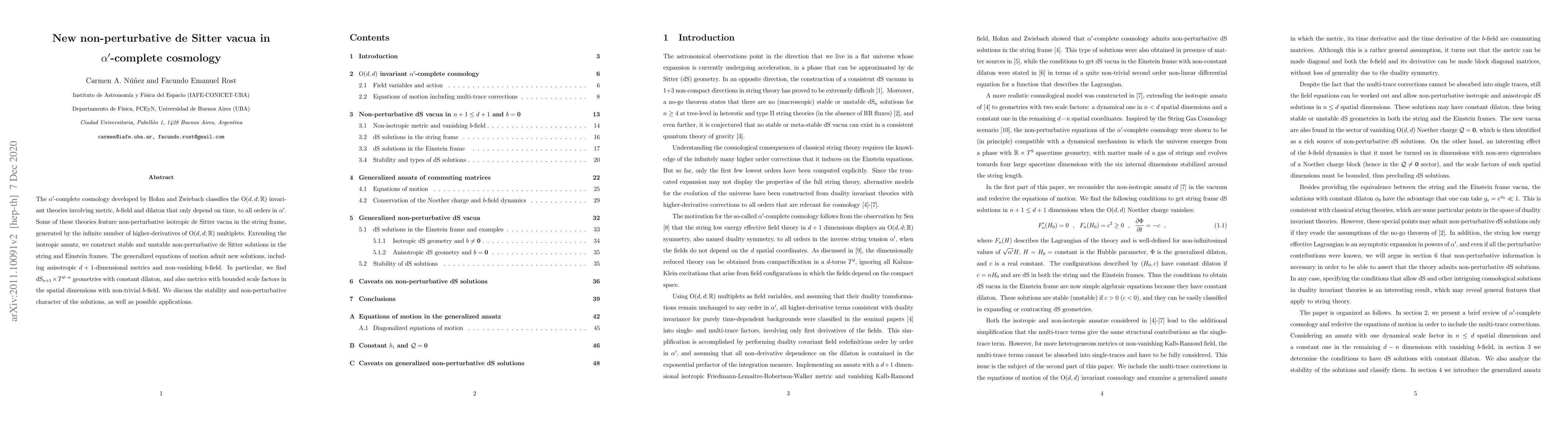 The paper introduces new non-perturbative de Sitter vacua in $\alpha'$-complete cosmology, constructing stable and unstable solutions that extend isotropic ansatz. It includes anisotropic metrics and non-trivial $b$-field configurations, examining their stability and potential applications.