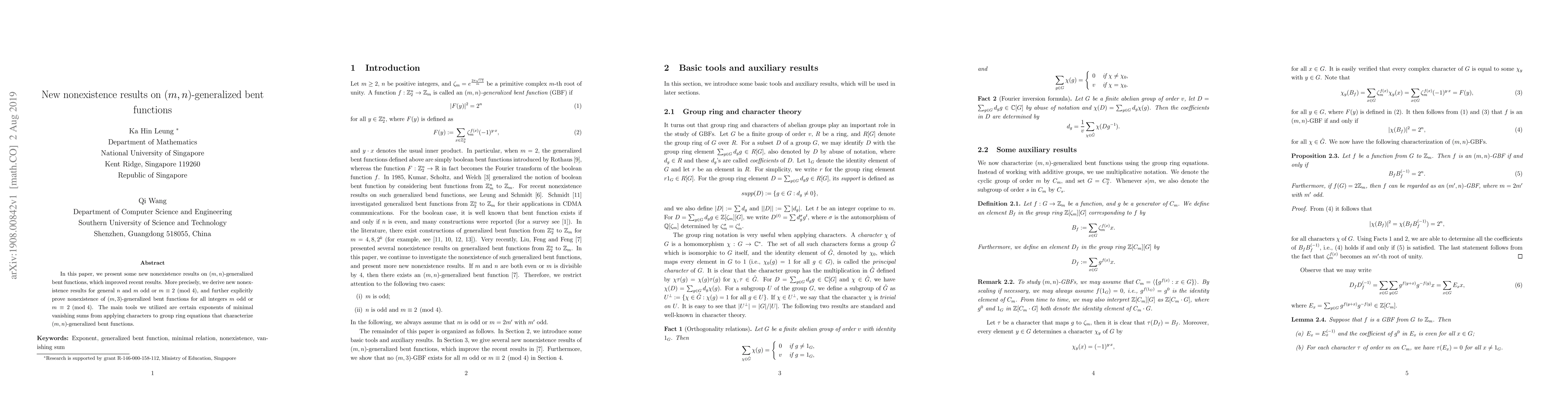 In this paper, we present some new nonexistence results on $(m,n)$-generalized bent functions, which improved recent results. More precisely, we derive new nonexistence results for general $n$ and $m$ odd or $m \equiv 2 \pmod{4}$, and further explicitly prove nonexistence of $(m,3)$-generalized bent functions for all integers $m$ odd or $m \equiv 2 \pmod{4}$. The main tools we utilized are certain exponents of minimal vanishing sums from applying characters to group ring equations that characterize $(m,n)$-generalized bent functions.