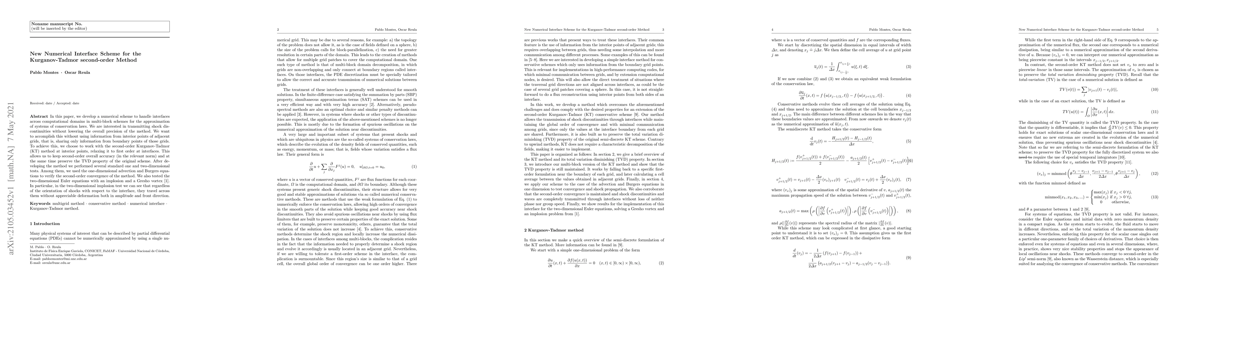 In this paper, we develop a numerical scheme to handle interfaces across computational domains in multi-block schemes for the approximation of systems of conservation laws. We are interested in transmitting shock discontinuities without lowering the overall precision of the method. We want to accomplish this without using information from interior points of adjacent grids, that is, sharing only information from boundary points of those grids. To achieve this, we choose to work with the second-order Kurganov-Tadmor (KT) method at interior points, relaxing it to first order at interfaces. This allows us to keep second-order overall accuracy (in the relevant norm) and at the same time preserve the TVD property of the original scheme. After developing the method we performed several standard one and two-dimensional tests. Among them, we used the one-dimensional advection and Burgers equations to verify the second-order convergence of the method. We also tested the two-dimensional Euler equations with an implosion and a Gresho vortex\cite{liska2003}. In particular, in the two-dimensional implosion test we can see that regardless of the orientation of shocks with respect to the interface, they travel across them without appreciable deformation both in amplitude and front direction.