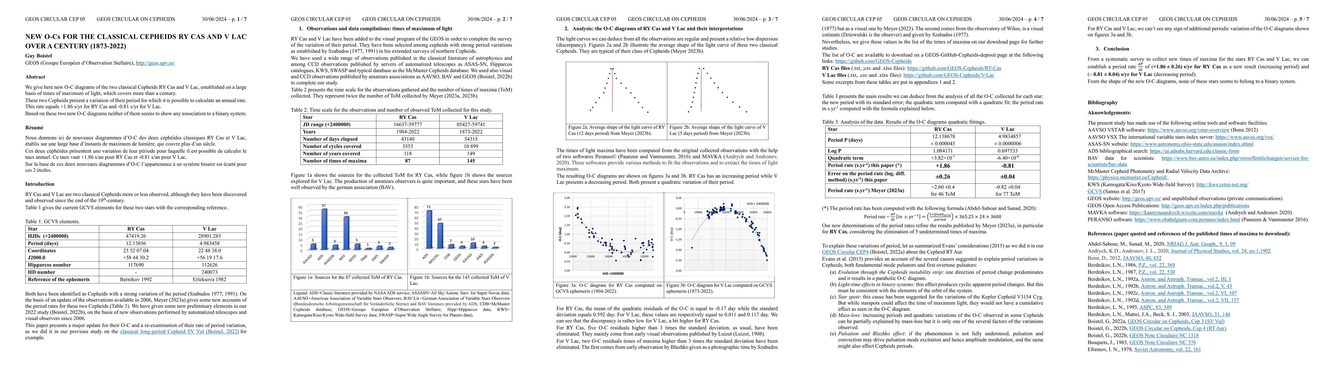 Summary: This study presents new O-C diagrams for classical Cepheids RY Cas and V Lac, based on over a century of maximum light times. RY Cas shows a period increase of +1.86 s/yr, while V Lac shows a decrease of -0.81 s/yr; neither exhibits evidence of a binary system influence.