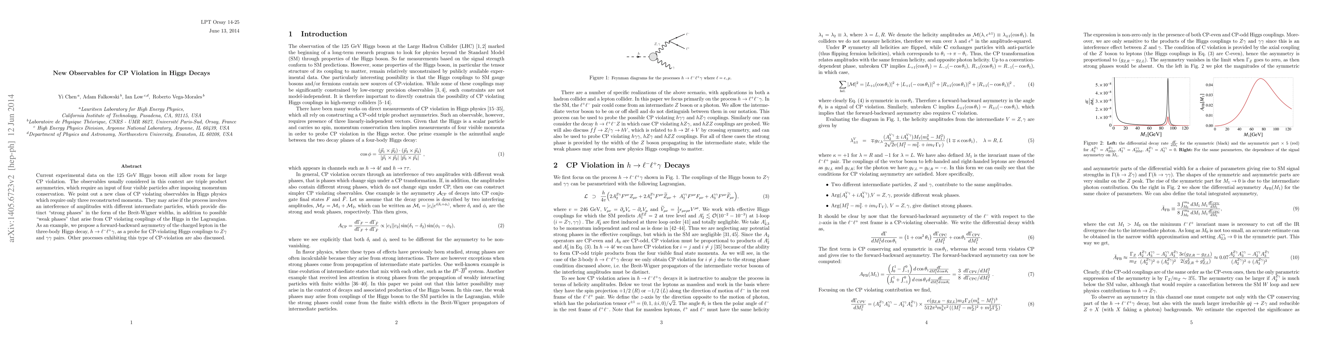 Current experimental data on the 125 GeV Higgs boson still allow room for large CP violation. The observables usually considered in this context are triple product asymmetries, which require an input of four visible particles after imposing momentum conservation. We point out a new class of CP violating observables in Higgs physics which require only three reconstructed momenta. They may arise if the process involves an interference of amplitudes with different intermediate particles, which provide distinct strong phases in the form of the Breit-Wigner widths, in addition to possible weak phases that arise from CP violating couplings of the Higgs in the Lagrangian. As an example, we propose a forward-backward asymmetry of the charged lepton in the three-body Higgs decay, $h\to \ell^-\ell^+ \gamma$, as a probe for CP-violating Higgs couplings to $Z\gamma$ and $\gamma\gamma$ pairs. Other processes exhibiting this type of CP-violation are also discussed.